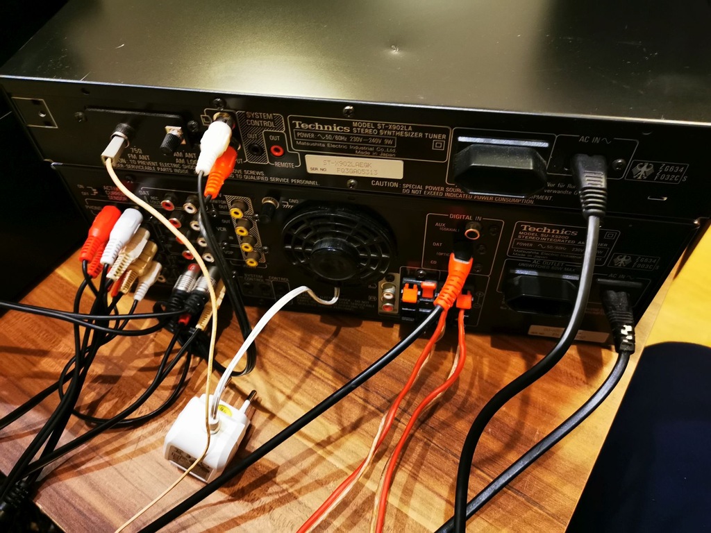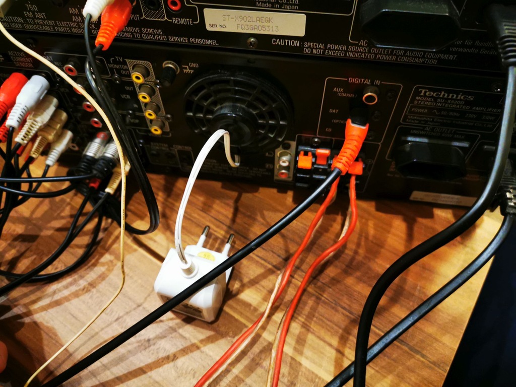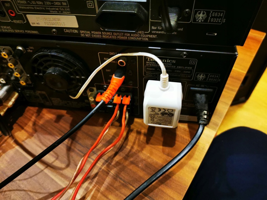 Wzmacniacz miał problemy z wentylatorem jak to bywa w Technicsie - wentylator powinien się uruchomić jak sprzęt się robi cieplejszy , w tym przypadku raz działał raz nie, więc została zrobiona w serwisie modyfikacja a mianowicie został wyprowadzony zasilacz, który po uruchomieniu wzmacniacza , nalezy podłączyc na wyjscie zasilania ( przelotkę ) - jak widać na zdjęciu. Jesli wzmacniacz sie wyłączy a wtyczka bedzie właczona cały czas ,to wentylator się bedzie kręcił na okragło, więc przy każdym uruchomieniu sprzętu ją z tyłu podłączam.