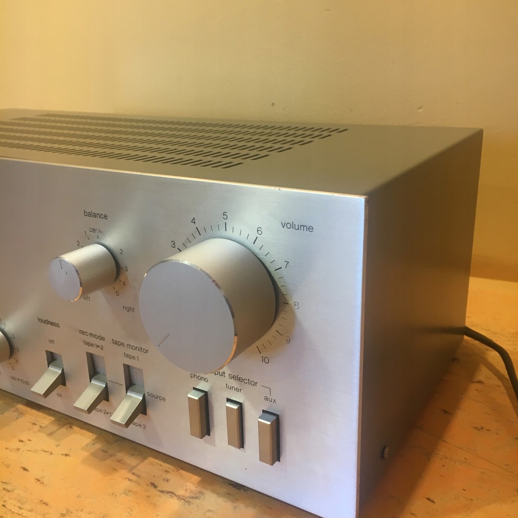 Wszystkie funkcje działają prawidłowo. Stan wizualny jest widoczny na zdjęcah.Podstawowe parametry tech.: pasmo przenoszenia od 10 Hz do 30 kHz , moc 2 x 25 W przy 8 om.. Wymiary: 420 x 145 x 220 , waga: ok. 5 kg. Zasilanie: 110 -240 V..