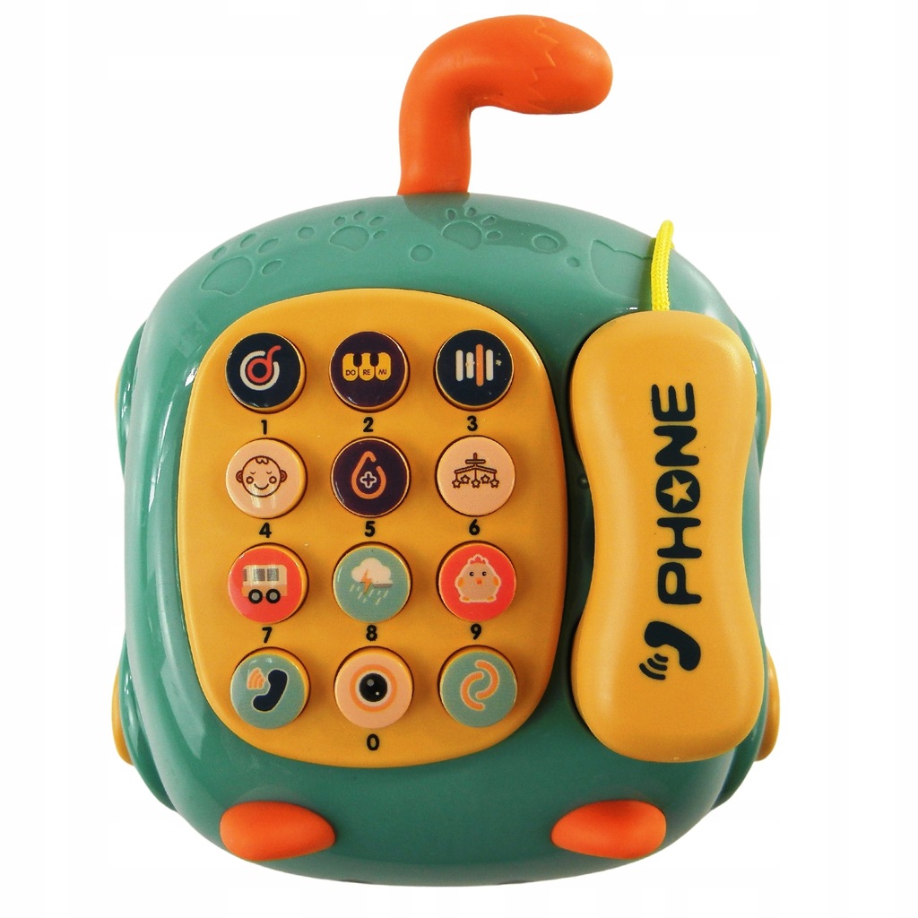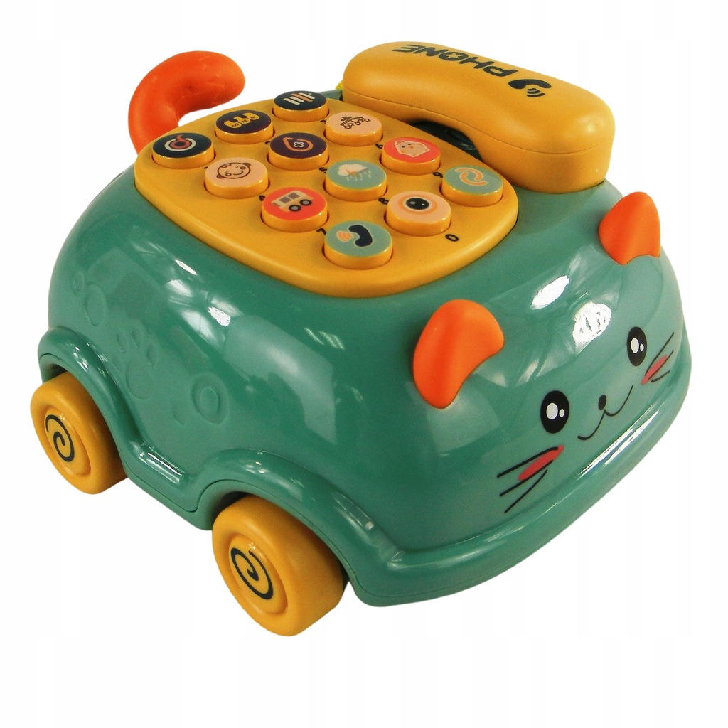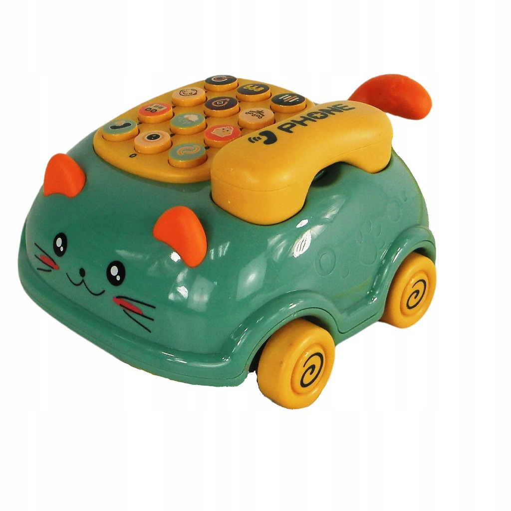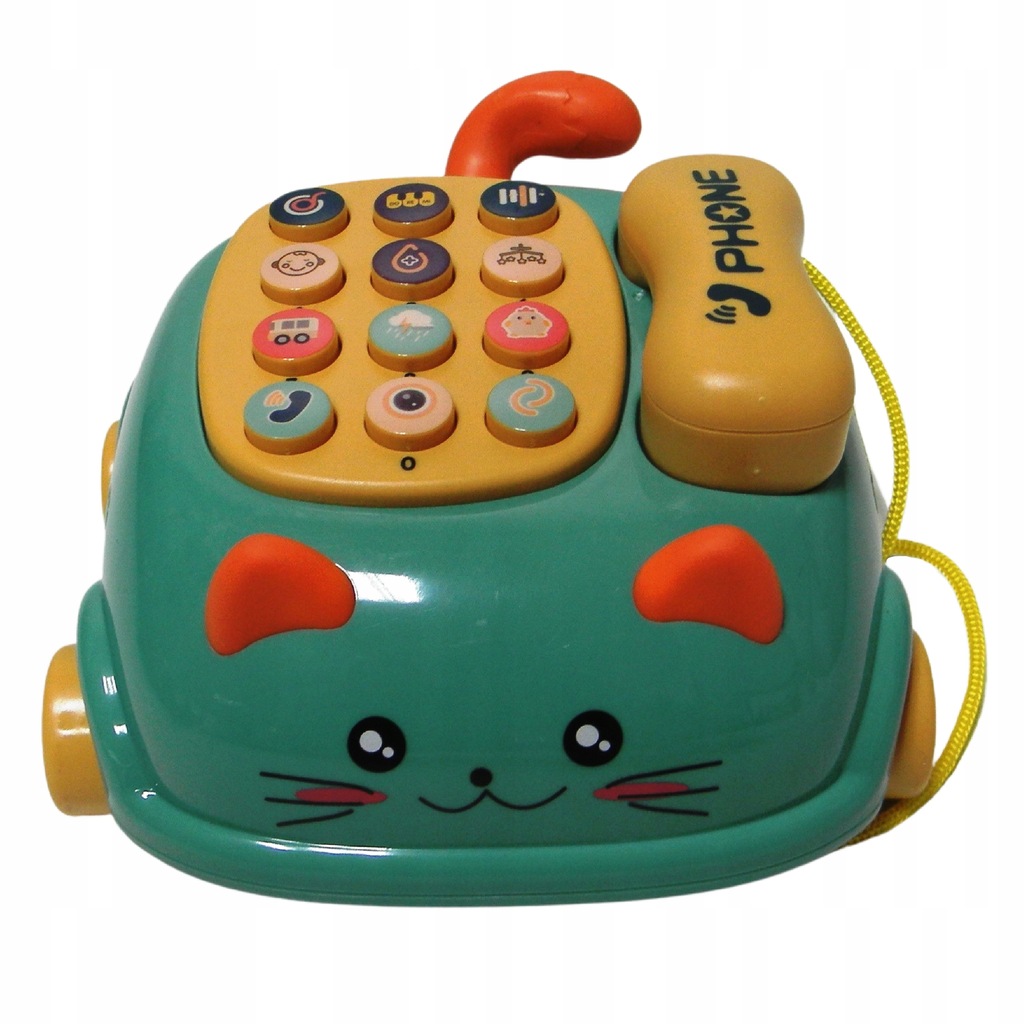 Telefon dla dzieci kotek jeździk dźwięk światło gryzakCzy wasze dziecko wciąż sięga rączką po Wasz telefon? Zapewnij Maluszkowi jego własny osobisty telefon muzyczny. Telefon stacjonarny nie tylko zajmie Twoje dziecko podczas zabawy, ale pełni również funkcję edukacyjną. Dzięki dużej ilości realistycznych dźwięków prawdziwego telefonu Twoje dziecko nauczy się obsługi tego gadżetu.Wymiary zabawki:Długość: 15,5 cmSzerokość: 12,5 cmWysokość: 8 cmDostępny kolor: zielonyWiek: 3+Zabawka posiada certyfikat EN71, CE.RUCHOMY OGONEKSYLIKINOWY OGONEK I USZY - GRYZAKITelefon można ciągnąć za sznureczek, pełni wtedy funkcje jeździka.Telefon posiada włącznik on/off na spodzie.Świetna zabawka edukacyjna ucząca obsługi prawdziwego telefonu w języku angielskim. Do tego śliczna kolorystyka, melodyjki i migające światełka zainteresują Twoja Pociechę na długi czas.Telefon stacjonarny posiada ściąganą słuchawkę na sznureczku, dzięki czemu Twoje dziecko może odbywać wirtualne rozmowy telefoniczne.Telefonik posiada 12 funkcyjnych guziczków:Guziczek w dolnym prawym roku zmienia funkcje pozostałych guziczków.Guziczek z cyfrą 1 i obrazkiem nutki: po naciśnięciu słychać dwie angielskie piosenek. Wszystkim dźwiękom towarzyszą świecące światełka.Guziczek z cyfrą 2 i obrazkiem pianinka: po naciśnięciu słychać osiem różnych melodyjek. Wszystkim dźwiękom towarzyszą świecące światełka.Guziczek z cyfrą 3 i obrazkiem linii melodyjnej: po naciśnięciu słychać dźwięki natury związane z wodą. Wszystkim dźwiękom towarzyszą świecące światełka.Guziczek z cyfrą 4 i obrazkiem bobasa: po naciśnięciu słychać osiem kołysanek. Wszystkim dźwiękom towarzyszą świecące światełka.Guziczek z cyfrą 5 i obrazkiem kropelki: po naciśnięciu uczymy się czterech angielskich słów: mother, father, grandfather, grandmother. Wszystkim dźwiękom towarzyszą świecące światełka.Guziczek z cyfrą 6 i obrazkiem karuzelki: po naciśnięciu słychać śmieszne dźwięki dzieci. Wszystkim dźwiękom towarzyszą świecące światełka.Guziczek z cyfrą 7 i obrazkiem autobusu: po naciśnięciu słychać dźwięki pojazdów. Wszystkim dźwiękom towarzyszą świecące światełka.Guziczek z cyfrą 8 i obrazkiem burzowej chmurki: po naciśnięciu słychać różne odgłosy burzy. Wszystkim dźwiękom towarzyszą świecące światełka.Guziczek z cyfrą 9 i obrazkiem kurczaczka : po naciśnięciu słychać pięć różnych dźwięków zwierząt. Wszystkim dźwiękom towarzyszą świecące światełka.Guziczek z obrazkiem słuchawki telefonu: Po naciśnięciu przycisku słychać różne dźwięki telefonu. Wszystkim dźwiękom towarzyszą świecące światełka.Guziczek z cyfrą 0 i obrazkiem obiektywu aparatu : po naciśnięciu słychać dźwięk robienia zdjęcia. Wszystkim dźwiękom towarzyszą świecące światełka.Wymiary opakowania: 15,5 x 13 x 7 cmWymiary zabawki:Długość: 15,5 cmSzerokość: 12,5 cmWysokość: 8 cmDługość telefonu ze sznureczkiem: 25 cmŚrednica guziczków: 1 cmDostępny kolor: zielonyBaterie: 2 x AA (brak w zestawie)Wiek: 3+Zabawka posiada certyfikat EN71, CE.Zabawka zapakowana w ładne kolorowe pudełko. Idealnie nadaje się na prezent.