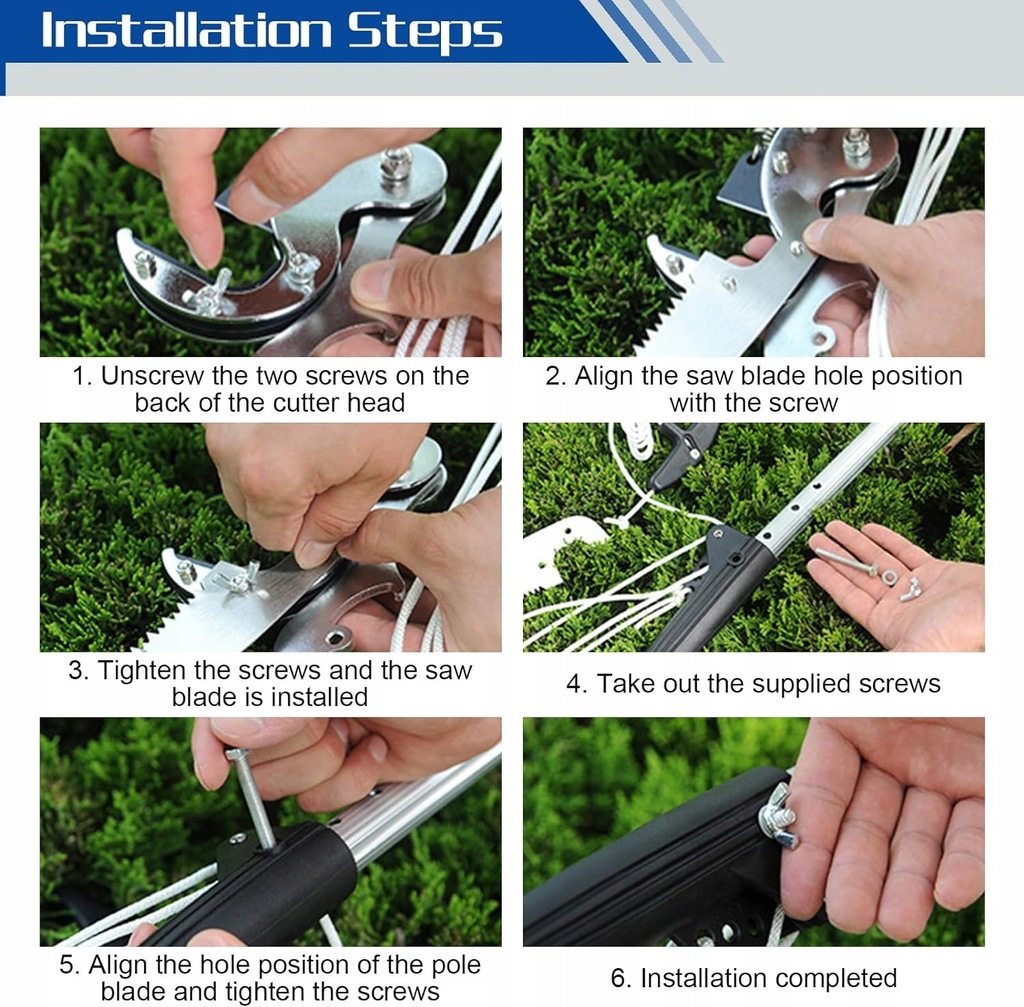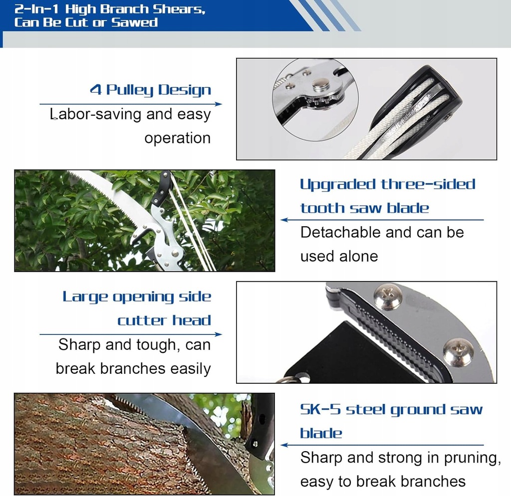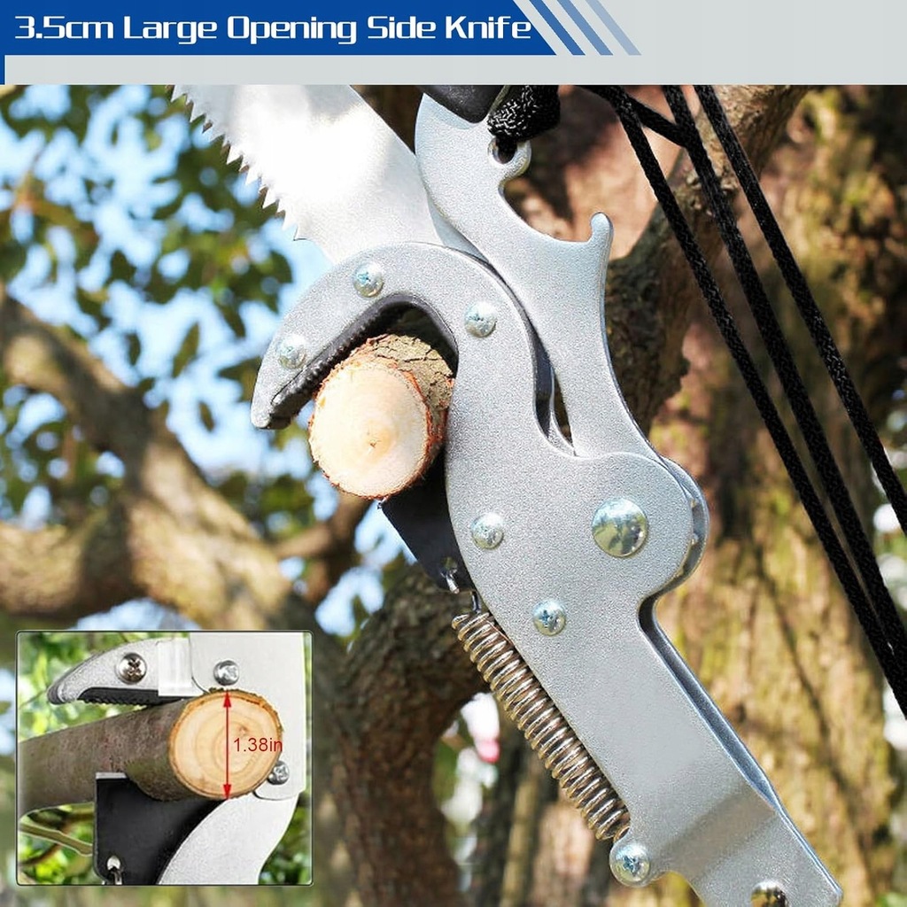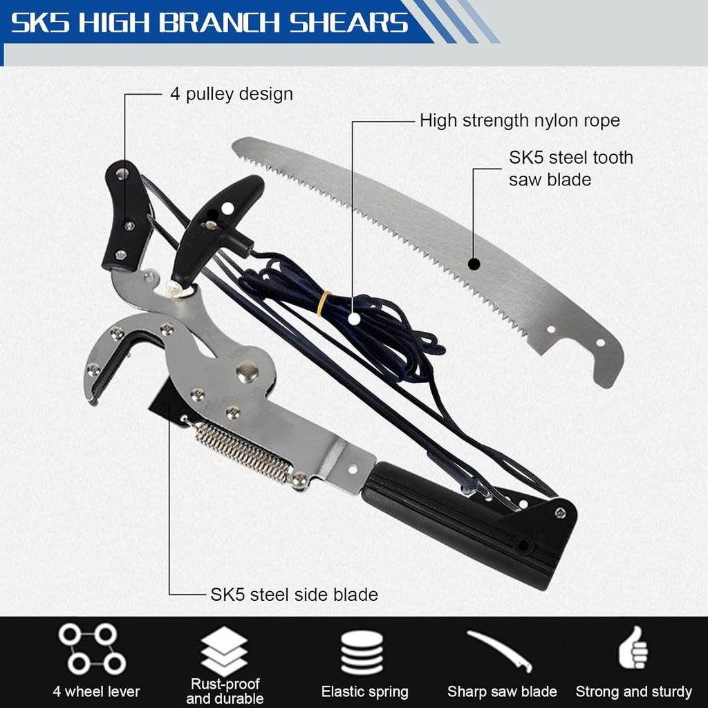 ✅Te teleskopowe nożyce do cięcia drzew z piłą składają się ze stalowych brzeszczotów bocznych SK5, stalowych brzeszczotów piły podłogowej SK5 i wytrzymałej linki nylonowej.