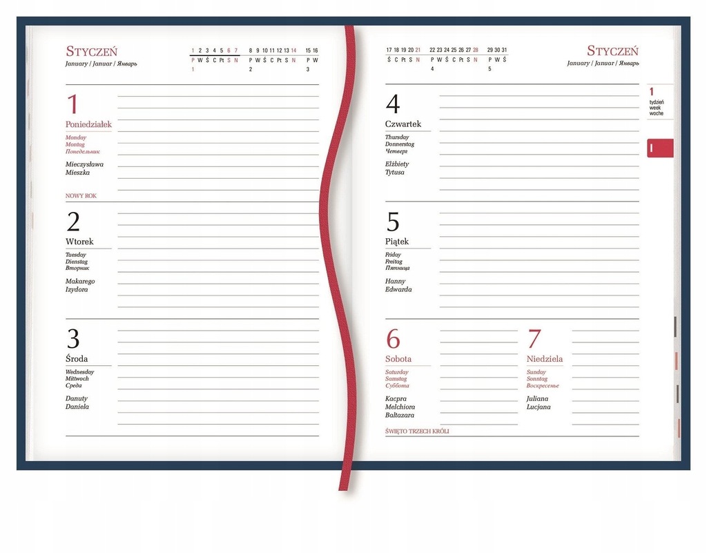 - format: A6 (105 x 145 mm)- układ kalendarium: 1 tydzień - 2 strony- ilość stron: 144- druk: 2 kolory- rodzaj papieru: offset 70 g/m2 biały- oprawa - skóropodobna Vivella- jedna tasiemka