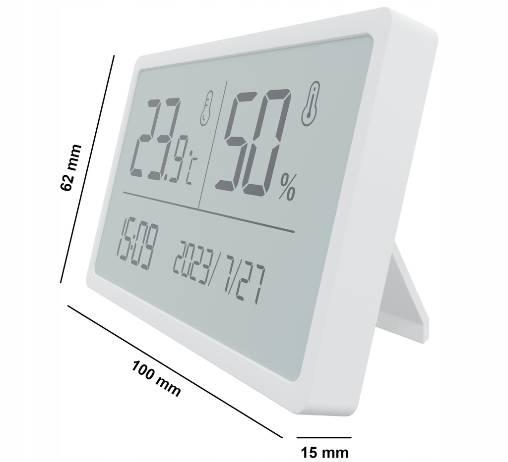 Urządzenie wyposażone jest w nóżkę, co pozwala na umieszczenie go w najbardziej dogodnym miejscu, takim jak biurko, parapet czy blat. Higrometr posiada również wbudowany magnes oraz taśmę dwustronną, które umożliwiają jego zawieszenie na ścianie, lodówce czy w garażu.