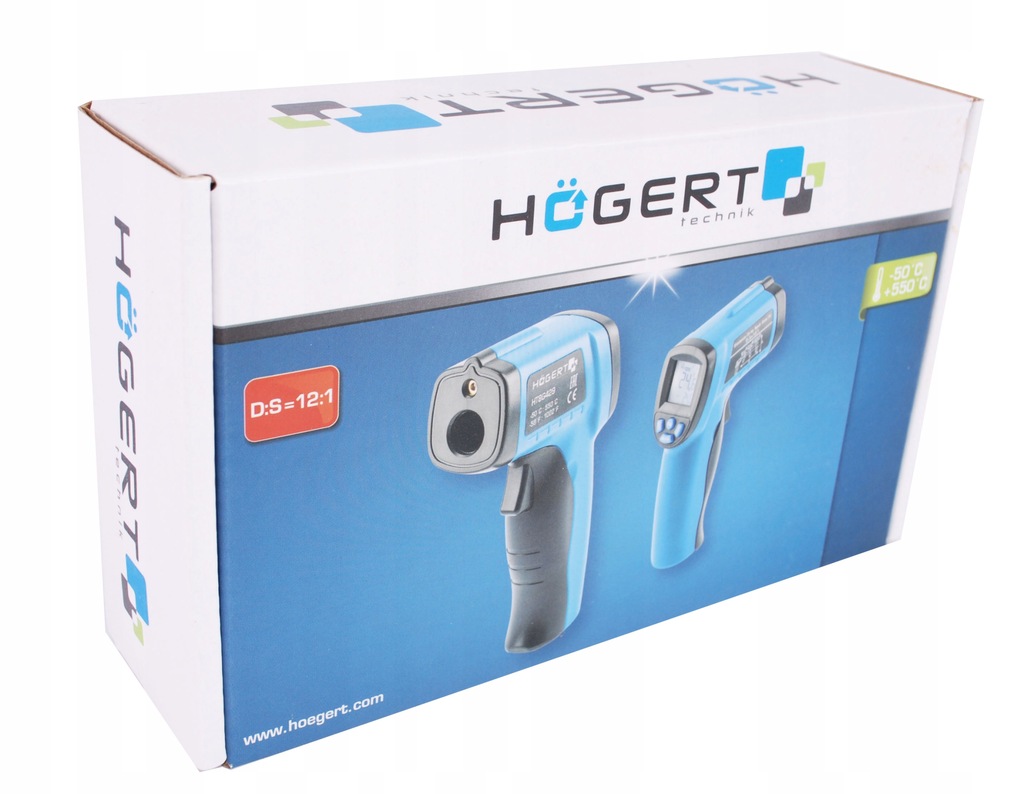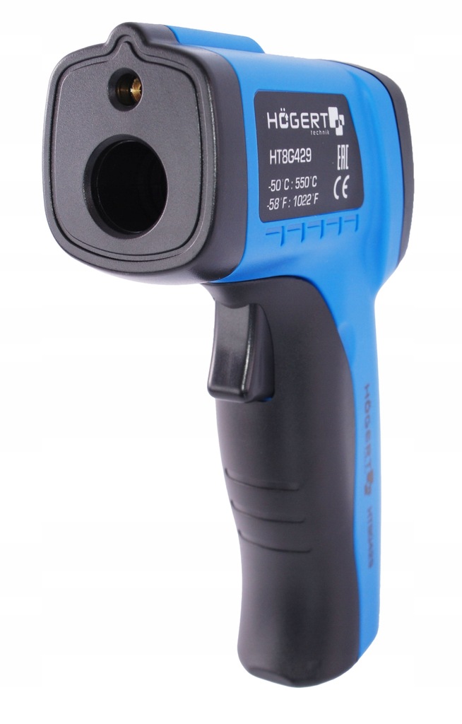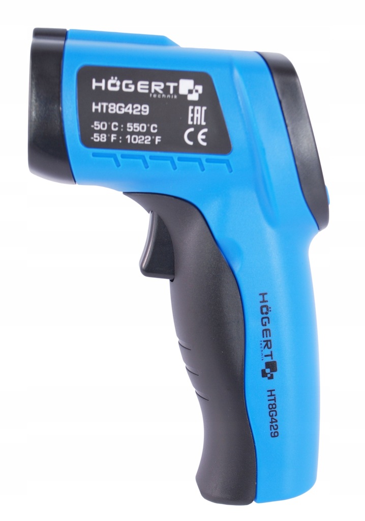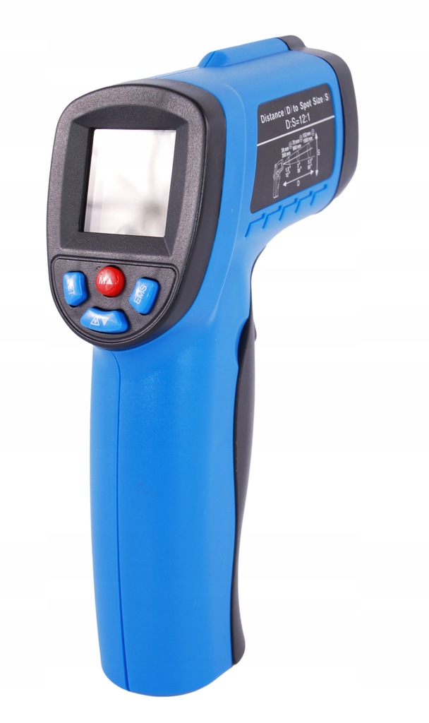 Bezkontaktowy termometr laserowy służący do pomiarów temperatury przedmiotów znajdujących się poza zasięgiem, w dalszej odległości, miejscach trudno dostępnych, niebezpiecznych w dotyku a także rzeczy będących w ruchu. Możliwość pomiaru w skali Fahrenheita i Celsjusza. Urządzenie dokonuje pomiaru w zakresie od -50 do 550 stopni.