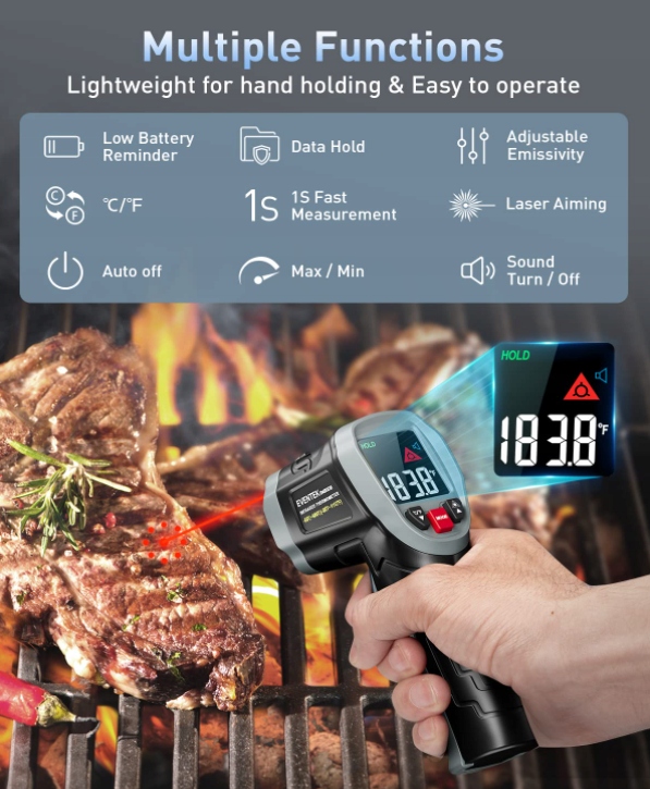 Wielofunkcyjny termometr laserowy na podczerwień: termometr na podczerwień Eventek posiada funkcje do pomiaru temperatury, wilgotności otoczenia, temperatury punktu rosy, elementu termicznego K, emisji promieniowania ultrafioletowego, regulacji emisji emisji i alarmu różnicy temperatury. W pełni opanujesz te interesujące funkcje w ciągu zaledwie kilku minut.