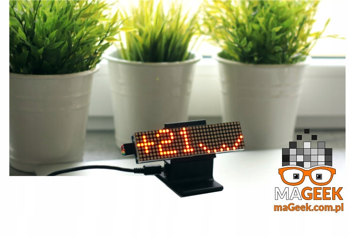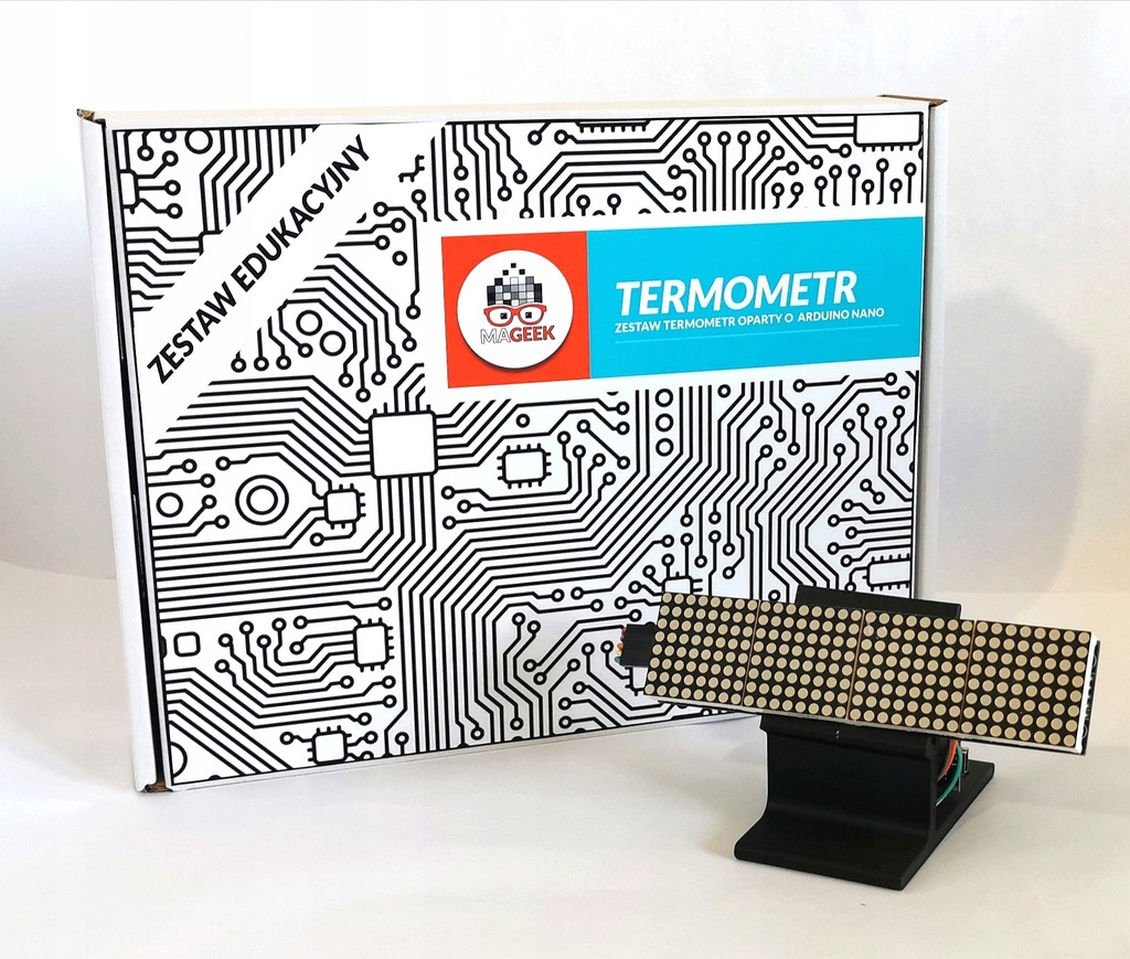 W zestawie znajdziesz wszystkie niezbędne części do zmontowania i uruchomienia termometru i wilgotnościomierza w jednym. Specjalnie zaprojektowana przez nas podstawka 3D umożliwi Ci zamontowanie na niej czujnika temperatury i wilgotności, płytki ARDUINO NANO i matrycy LED o rozdzielczości 32×8.