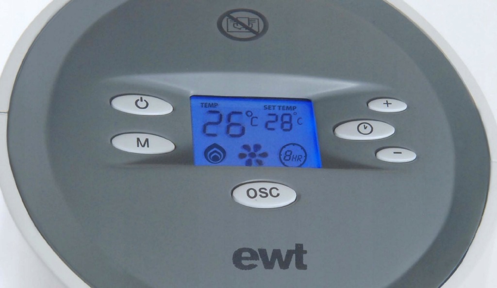 ewt jest częścią irlandzkiej grupy Glen Dimplex International Group, znanego gracza w sektorze technologii ogrzewania i chłodzenia. Od ponad 50 lat ewt jest synonimem innowacyjnego designu, bezpieczeństwa elektrycznego i wysokiej jakości. Nasze grzejniki umożliwiają efektywną kontrolę temperatury i są zaprojektowane tak, aby spełniać wszelkie wymagania estetyczne. Oznacza to, że możesz czuć się całkowicie komfortowo w każdej dziedzinie życia i środowiska życia. Ceramiczny termowentylator C 220 LCD zapewnia odpowiednie ogrzewanie lub chłodzenie dzięki dwóm poziomom grzania i jednemu poziomowi zimnego powietrza, a także oczyszcza i odnawia zużyte powietrze za pomocą jonizatora. Filtr powietrza zbiera kurz z powietrza. Grzejnikiem można sterować za pomocą niebieskiego wyświetlacza lub za pomocą praktycznego pilota. Ceramiczny element grzejny jest szczególnie trwały i wydajny. Dzięki funkcji oscylacji ciepło lub chłodne powietrze rozprowadzane jest ruchami obrotowymi. Ustawiona temperatura, tryb ogrzewania i symbole wentylatora pojawiają się na niebieskim, świecącym wyświetlaczu. Na wyświetlaczu pokazywana jest także aktualna temperatura powietrza. Podświetlenie wyłącza się po 15 sekundach, jeśli nie zostanie naciśnięty żaden przycisk sterujący. Za pomocą przycisków można regulować temperaturę, wentylator, oscylację, tryby pracy i timer. C 220 LCD można łatwo obsługiwać za pomocą dołączonego pilota - wygodnie z kanapy lub biurka. Filtr powietrza zbiera kurz i kłaczki. Dzięki temu możesz cieszyć się czystym powietrzem, co jest szczególnie korzystne dla alergików i osób mających problemy z oddychaniem. C 220 LCD posiada również jonizator, który oczyszcza, odnawia i rewitalizuje zużyte powietrze.
