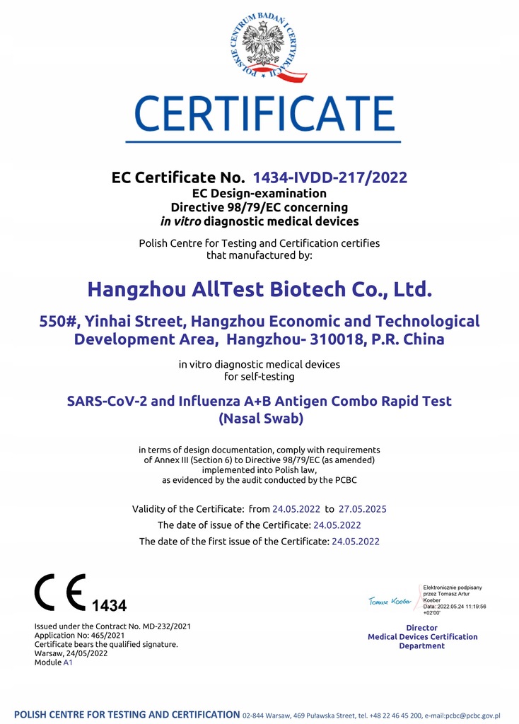 Test Combo Antygen na grypę A/B + COVID-19 jest testem immunochromatograficznym, który pozwala na wykrycie obecności antygenów wirusa SARS-CoV-2 oraz antygenów grypy a i/lub B w warunkach domowych. Działanie testu oparte jest na wykorzystaniu zawartych w kasecie testowej swoistych przeciwciał monoklonalnych skierowanych przeciwko antygenom charakterystycznym dla wykrywanych wirusów.
