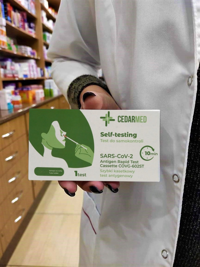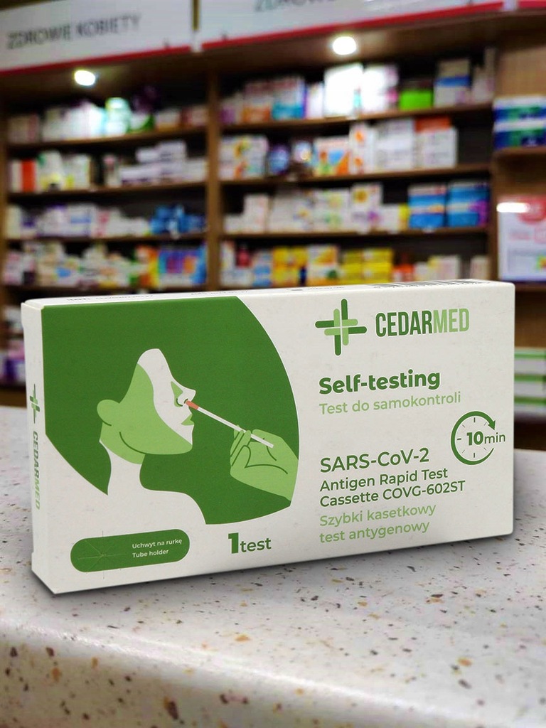 Rekomendowany do samodzielnego wykonania szybki test antygenowy CEDARMED SARS-CoV-2 Antigen Rapid Test Cassette COVG-602ST. Do wykonania badanie potrzebna jest próbka z wymazu z przedniej części nosa. Wynik można odczytać po 15 minutach. Test o wysokiej czułości, swoistości i dokładności.