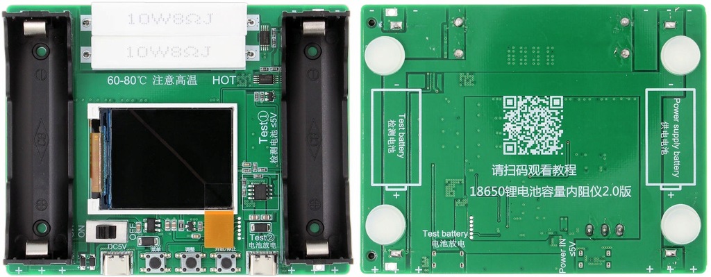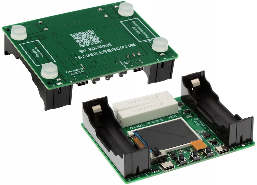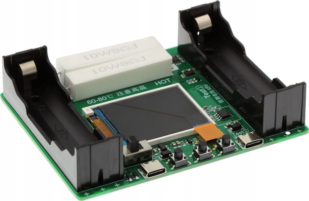 Tester ogniw 18650 umożliwia pomiar pojemności i rezystancji wewnętrznej ogniw. Dodatkowo urządzenie posiada możliwość ładowania ogniw przez wbudowany port USB-C. Wbudowany po prawej stronie koszyk przeznaczony jest do testowania ogniw, zaś ten po lewej do zasilania układu.