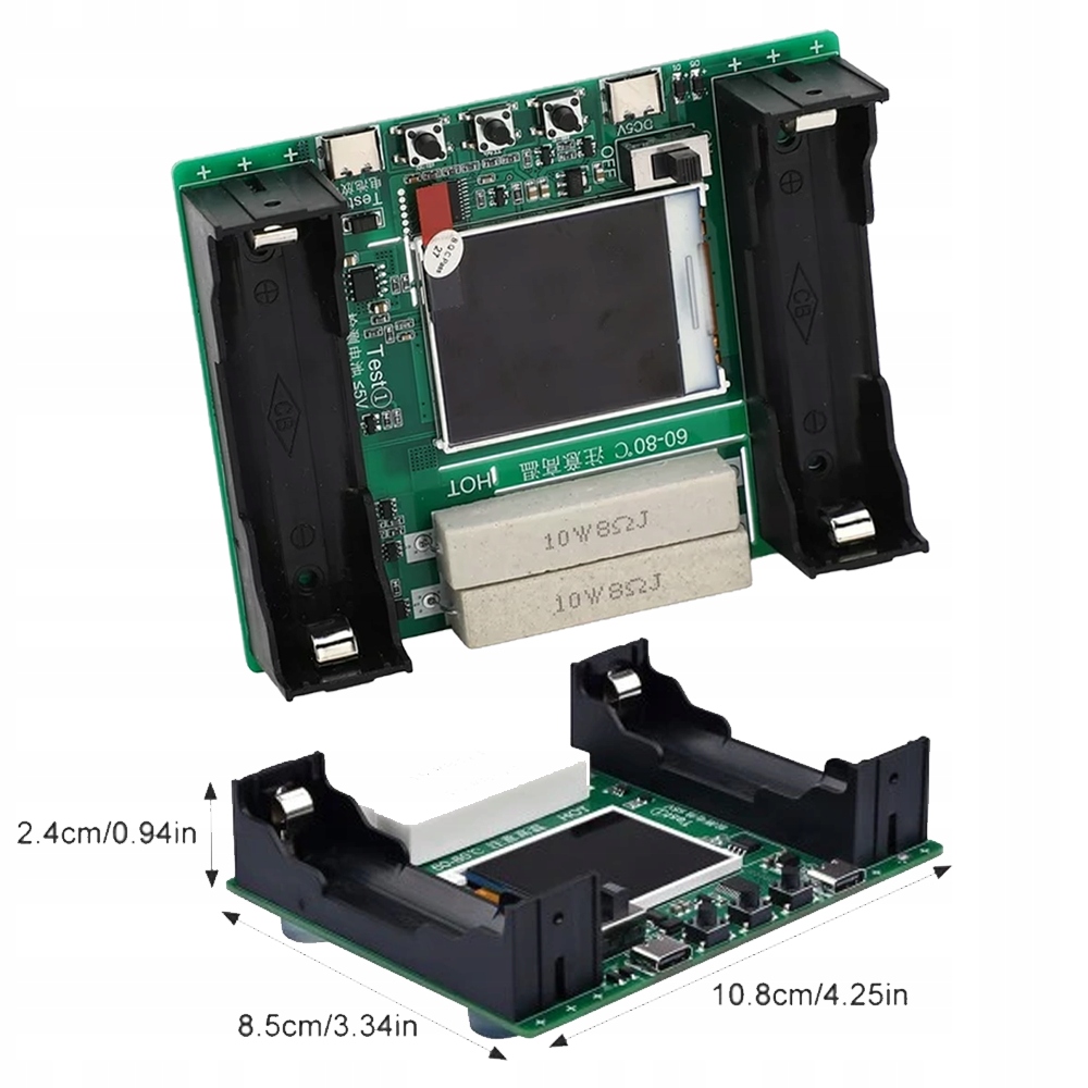 Tester ogniw 18650 umożliwia pomiar pojemności i rezystancji wewnętrznej ogniw. Dodatkowo urządzenie posiada możliwość ładowania ogniw przez wbudowany port USB-C. Wbudowany po prawej stronie koszyk przeznaczony jest do testowania ogniw, zaś ten po lewej do zasilania układu