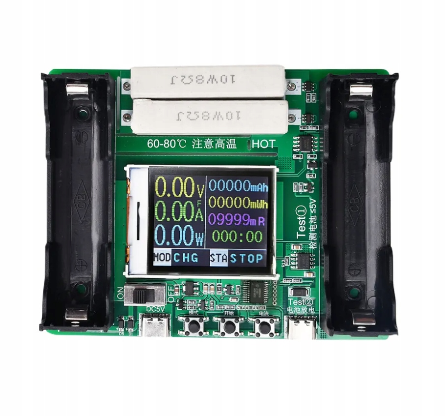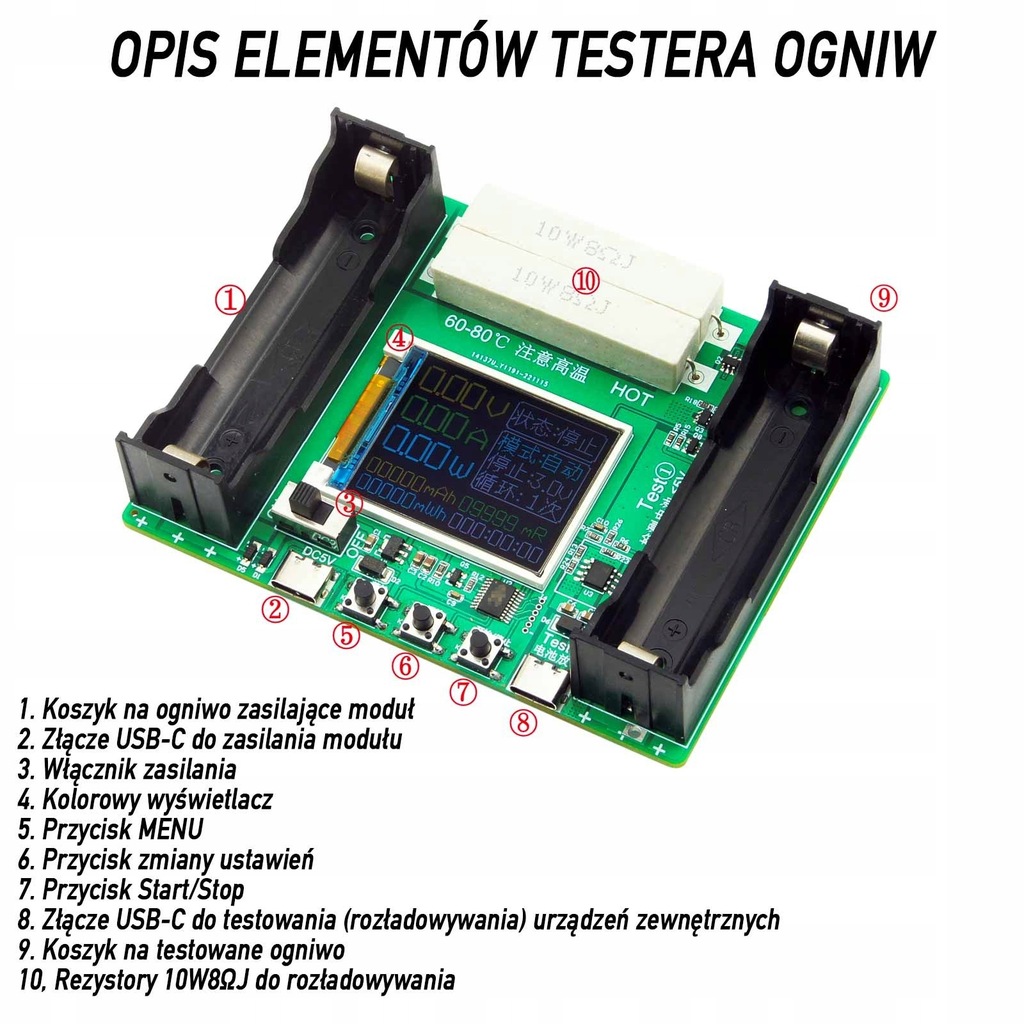 Tester ogniw 18650 umożliwia pomiar pojemności i rezystancji wewnętrznej ogniw. Dodatkowo urządzenie posiada możliwość ładowania ogniw przez wbudowany port USB-C. Wbudowany po prawej stronie koszyk przeznaczony jest do testowania ogniw, zaś ten po lewej do zasilania układu.