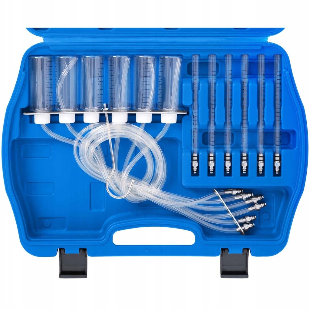 Za pomocą testera przelewowego wtryskiwaczy MSW można szybko i łatwo określić ich objętość powrotną. Dzięki licznym adapterom ten obszerny zestaw narzędzi jest odpowiedni dla prawie wszystkich wtryskiwaczy i nie powinno zabraknąć go w żadnym warsztacie. Tester jest łatwy i elastyczny w użyciu. Pomiar każdego wtryskiwacza jest precyzyjny i dokładny. Węże przyłączeniowe montuje się bezpośrednio na praktycznych naczyniach pomiarowych. Gdy tester common rail nie jest używany, wystarczy schować wszystkie przybory do plastikowej walizki transportowej.