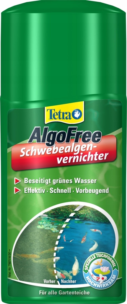 Tetra Pond AlgoFree eliminuje zieloną wodę nawet w niskich temperaturach, zapobiegając pierwszym wiosennym falom glonów. Może być z powodzeniem stosowany profilaktycznie. Sposób działania AlgoFree jest prosty składniki aktywne preparatu trwale łączą się ze ścianą komórkową alg, która pod ich wpływem pęka. Pozostałości alg z cząsteczkami substancji czynnej rozkładają się w naturalny sposób. Można je również usunąć mechanicznie.