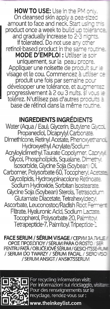 The INKEY List Retinol Serum pomaga zmniejszać widoczność drobnych linii i zmarszczek, przy mniejszym ryzyku wywołania podrażnień. Poprawia i wyrównuje niejednolity koloryt skóry, dzięki czemu cera jest rozjaśniona i ujednolicona.