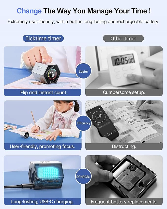 - Cube Timer Flip Timer, łatwy w użyciu, Timer Pomodoro dla minutnika kuchennego dla dzieci