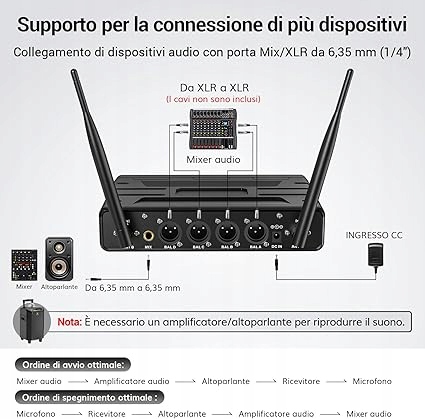 Łatwy w użyciu: Wystarczy włączyć odbiornik, a ten automatycznie zsynchronizuje się z częstotliwością nadajnika. Do każdego mikrofonu bezprzewodowego potrzebne są 2 baterie AA (brak w zestawie).