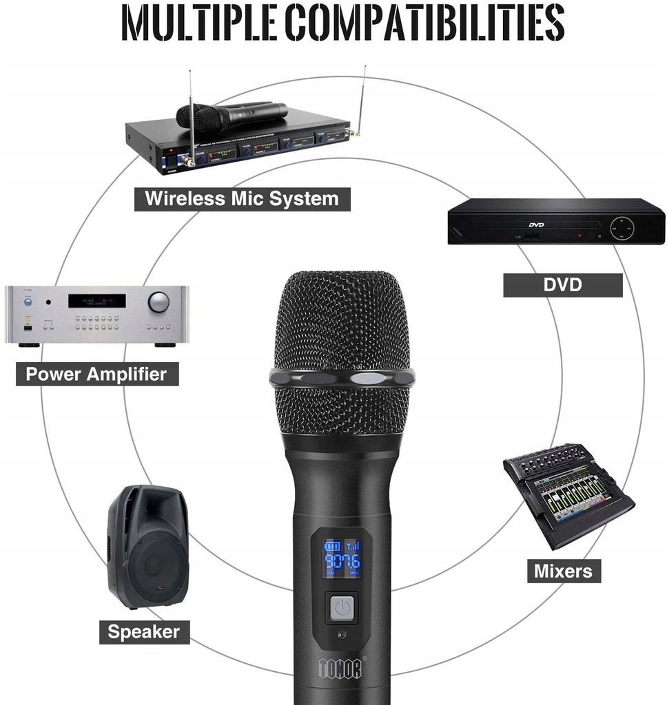 - ŁATWY W ŁĄCZENIU, ŁATWY DO GRY - bezprzewodowy mikrofon TONOR jest łatwy do podłączenia i odtwarzania. Włóż odbiornik do zestawu stereo, włącz mikrofon i zacznij używać. Nie ma potrzeby parowania lub łączenia w jakikolwiek inny sposób. Złącze 6,35 mm na odbiorniku i dołączony adapter 3,5 mm pozwala na wygodne wykorzystanie mikrofonu do stereo, wzmacniaczy, systemów kina domowego, KTV, konsol miksujących, autobusów turystycznych i urządzeń muzycznych, takich jak soundbary.