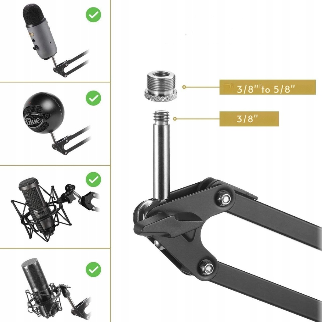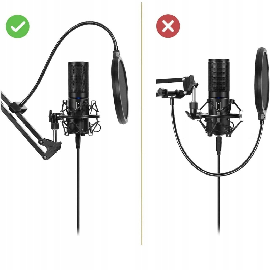 - Zawartość zestawu: zestaw zawiera wszystko, co niezbędne do rozpoczęcia pracy: ramię mikrofonowe, zacisk stołowy, klamrę mikrofonu, adapter 3/8" do 5/8", filtr Pop, osłonę piankową, cztery opaski kablowe oraz instrukcję obsługi (może nie być dostępna w języku polskim).