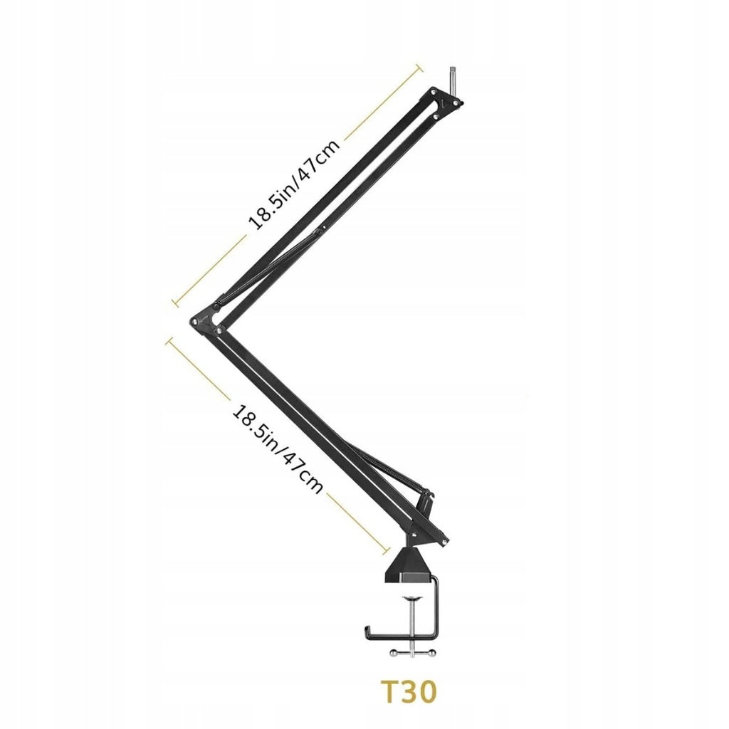 - Zastosowanie: model T30 służy do stabilnego mocowania mikrofonu oraz precyzyjnego ustawiania jego pozycji podczas nagrań i transmisji dźwięku. Dzięki regulowanemu ramieniu umożliwia wygodne dopasowanie mikrofonu do potrzeb użytkownika, co poprawia jakość dźwięku i komfort pracy. Jest wykorzystywany zarówno w studiach nagraniowych, jak i podczas występów na żywo czy streamingu.
