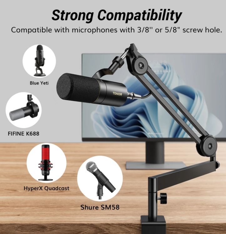 Wysoka kompatybilność: Wysięgnik jest wyposażony w śrubę o rozmiarze 3/8'' i zawiera śrubę adaptera 5/8'', zapewniając kompatybilność z obydwoma rozmiarami otworów na śruby mikrofonu. Umożliwia to bezproblemową kompatybilność z dowolnym mikrofonem, zapewniając nieograniczone profesjonalne wrażenia podczas nagrywania.