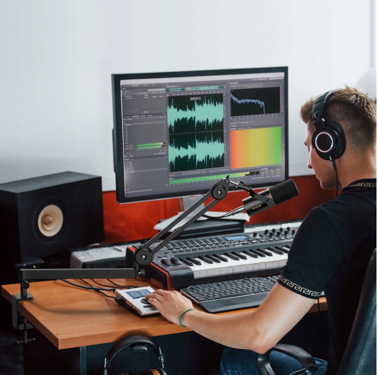 Obrotowy i regulowany: Dzięki 360-stopniowemu obrotowi w poziomie i 90-stopniowej regulacji w pionie, T40LP oferuje doskonałą elastyczność. Jego rozszerzalność do 30,3 cala (77 cm) szerokości i 19,1 cala (48,5 cm) wysokości sprawia, że nadaje się do biurek o dowolnym rozmiarze. Wielokrotne regulacje kąta pozwalają na wygodniejsze mówienie, śpiewanie i nagrywanie.