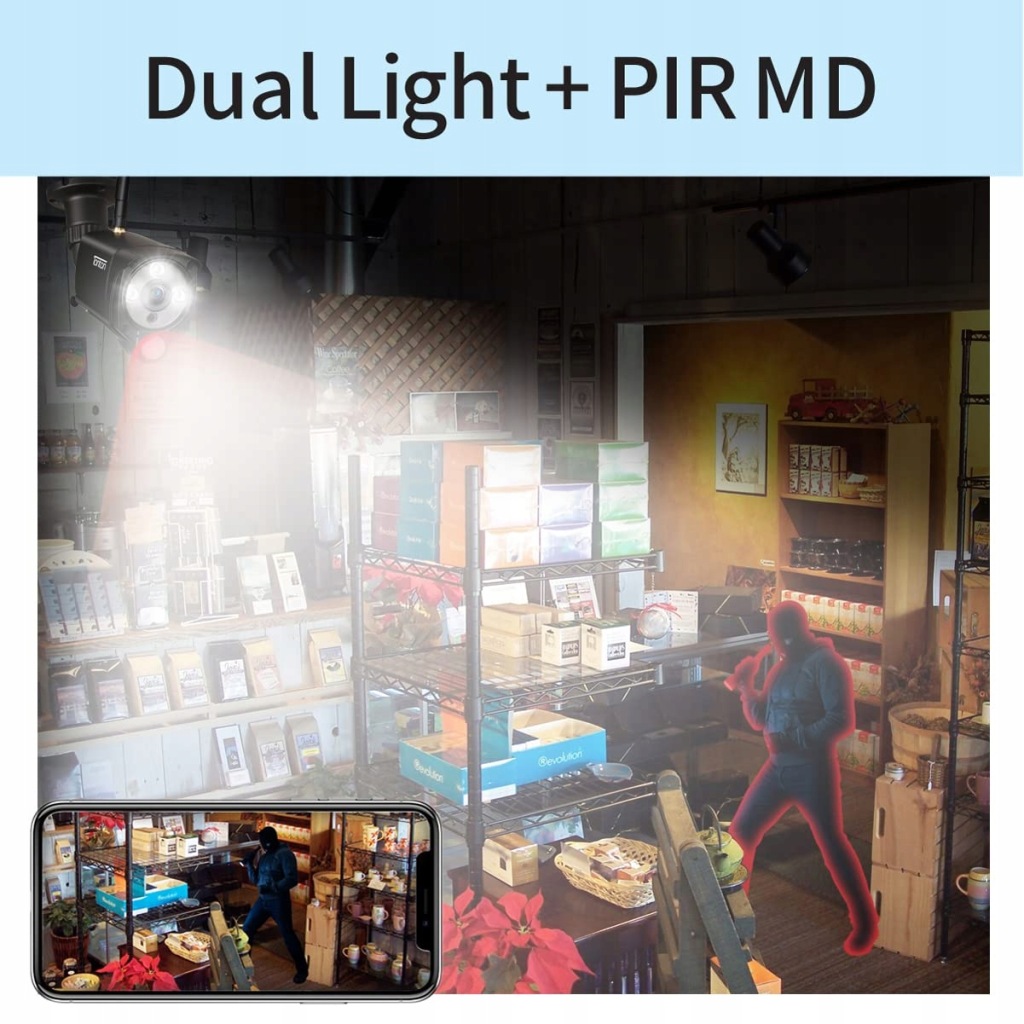 Prosty system połączenia Wi-Fi umożliwia zdalne monitorowanie za pomocą smartfonów i laptopów. Inteligentny czujnik ruchu AI PIR redukuje błędne alarmy, zapewniając ochronę wideo 3 MP i widoczność w nocy do 30 m. Idealny do użytku wewnątrz i na zewnątrz dzięki wodoodpornej obudowie.