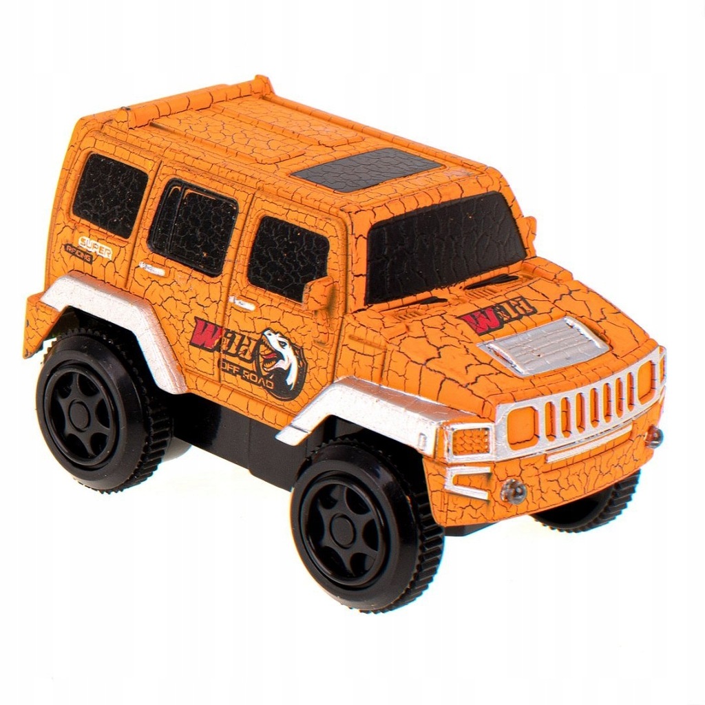 W zestawie zasilany bateriami samochodzik, który jeździ po torze.