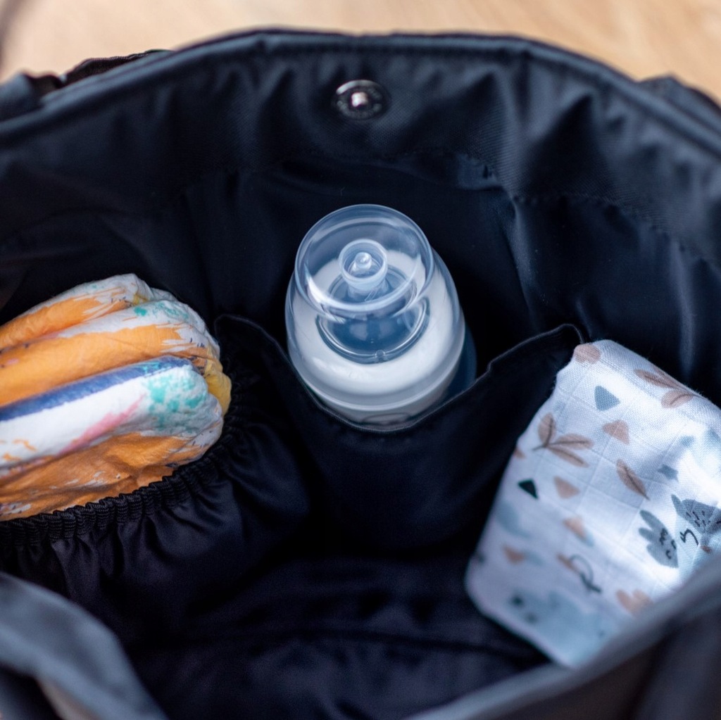 - W środku trzy praktyczne kieszenie boczne, w które bez problemu zmieścisz zapasowe pampersy, pieluszkę, czy butelkę lub bidon