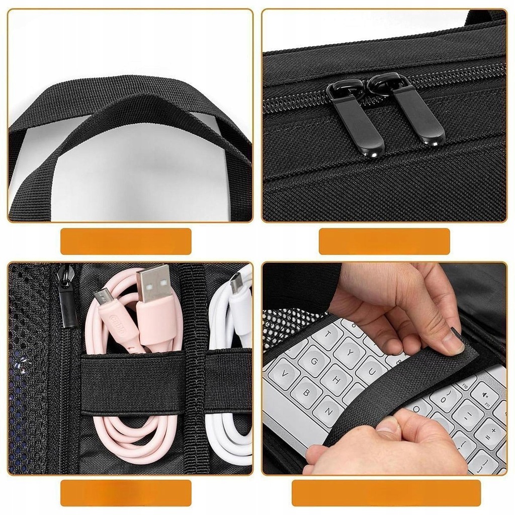 [Wiele kieszeni]: Nasza torba na klawiaturę komputerową ma łącznie 10 kieszeni. 2 przednie kieszenie zapinane na suwak, 1 kieszeń przednia, 1 kieszeń tylna, 2 kieszenie z siatki zapinane na suwak oraz 6 elastycznych kieszeni wewnątrz na kable i inne akcesoria.