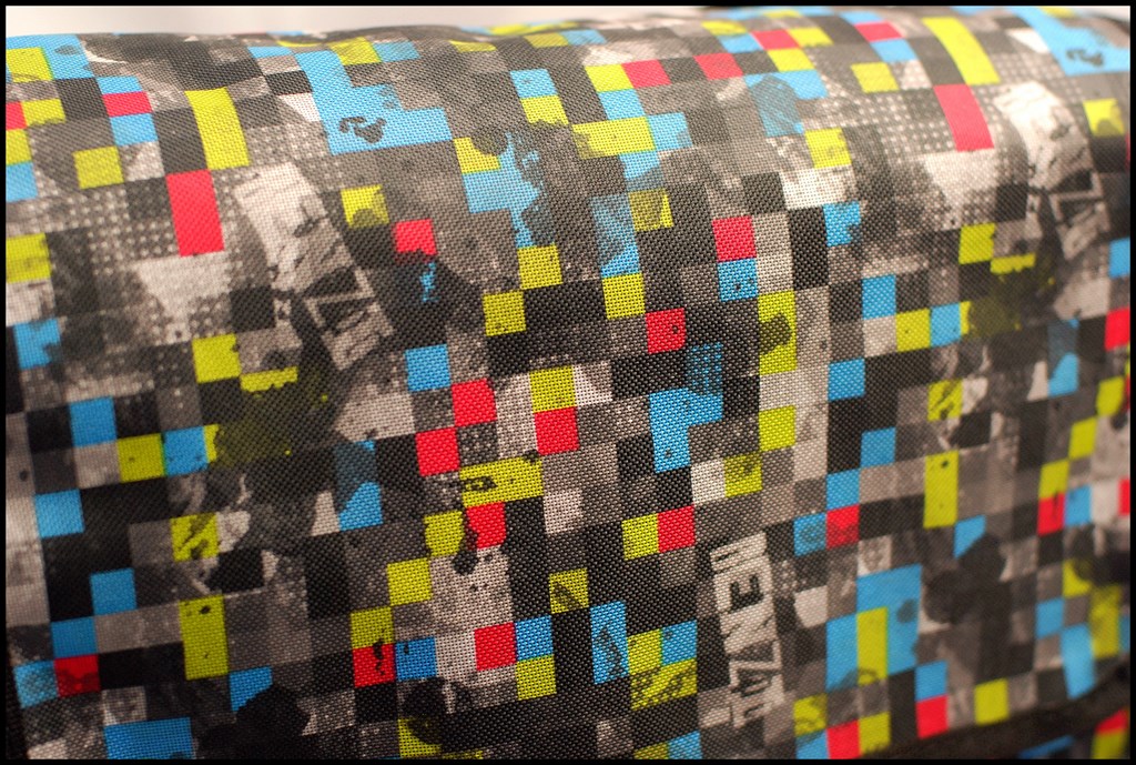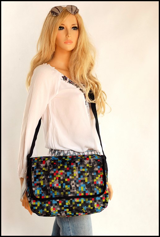 czarna w niebieskie, popielate, różowe i zielone kwadraciki
