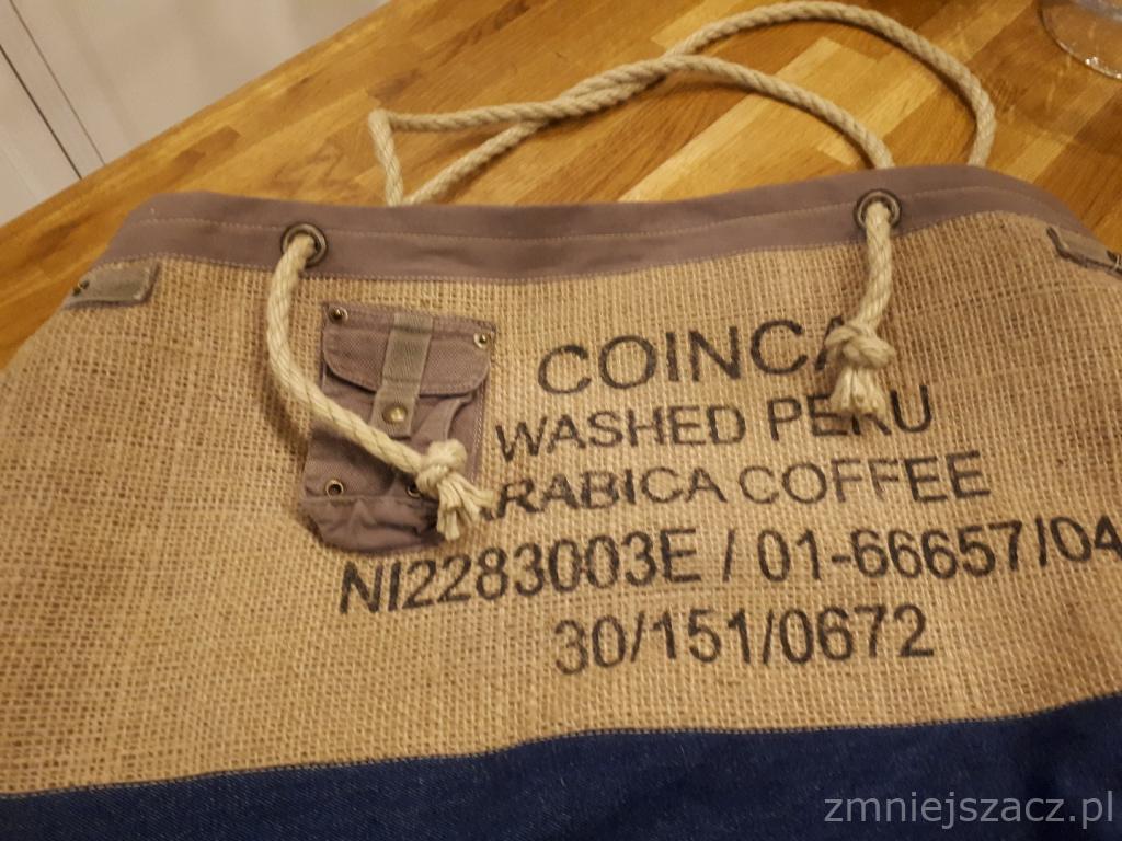 Torba z worka w którym kawa przypływa do Polski, upcycling. W środku torby len i praktyczna lniana kieszonka na suwak Uszy wykonane z naturalnego grubego sznurka Wymiary torby - ok. 66x45cm ,po bokach regulacja szerokości .Jedyna nie powtarzalna ręcznie wykonana :)