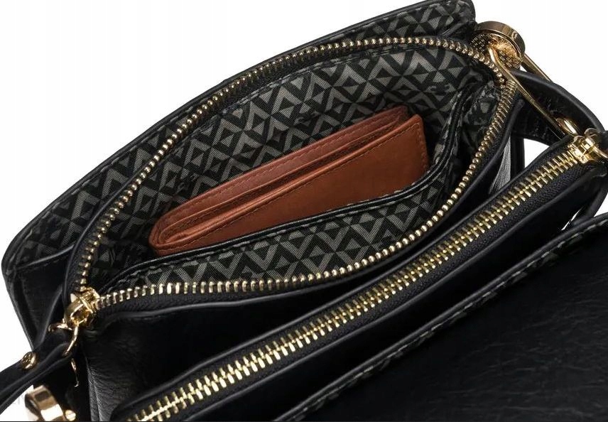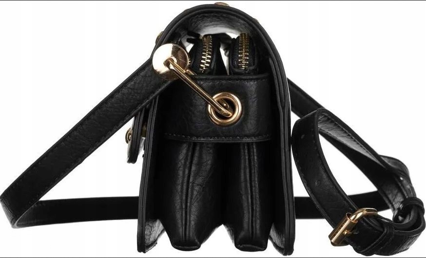 - Listonoszka damska z klapką na magnetyczny klips. Wykonana z gładkiej skóry ekologicznej wysokiej jakości. W klapie ozdobne, złote nity. Model z czterema komorami, wykończony podszewką. Listonoszka na długim, regulowanym pasku.