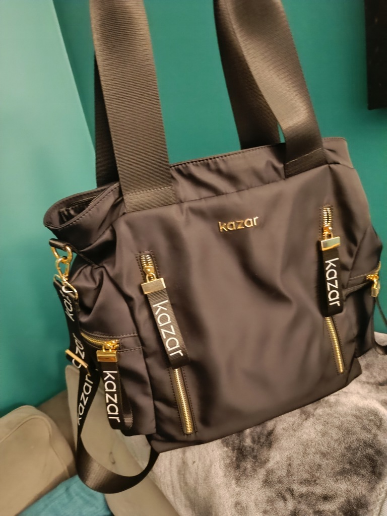 Torba zakupiona na kazar.pl czarna złote dodatki stan idealny, nie noszę więc chętnie sprzedam. Tkanina nie przemaka lekka, zero otarć itp. Wymiary podane na zdjęciu. Fakturę wysyłam po zakupie na mail.