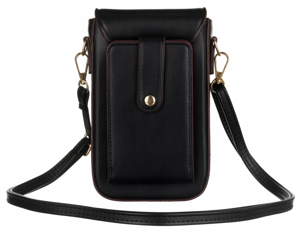 Na zewnątrz z tyłu kieszeń na telefon zapinana na zatrzask. W środku sześć kieszonek na karty.