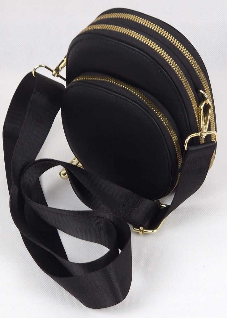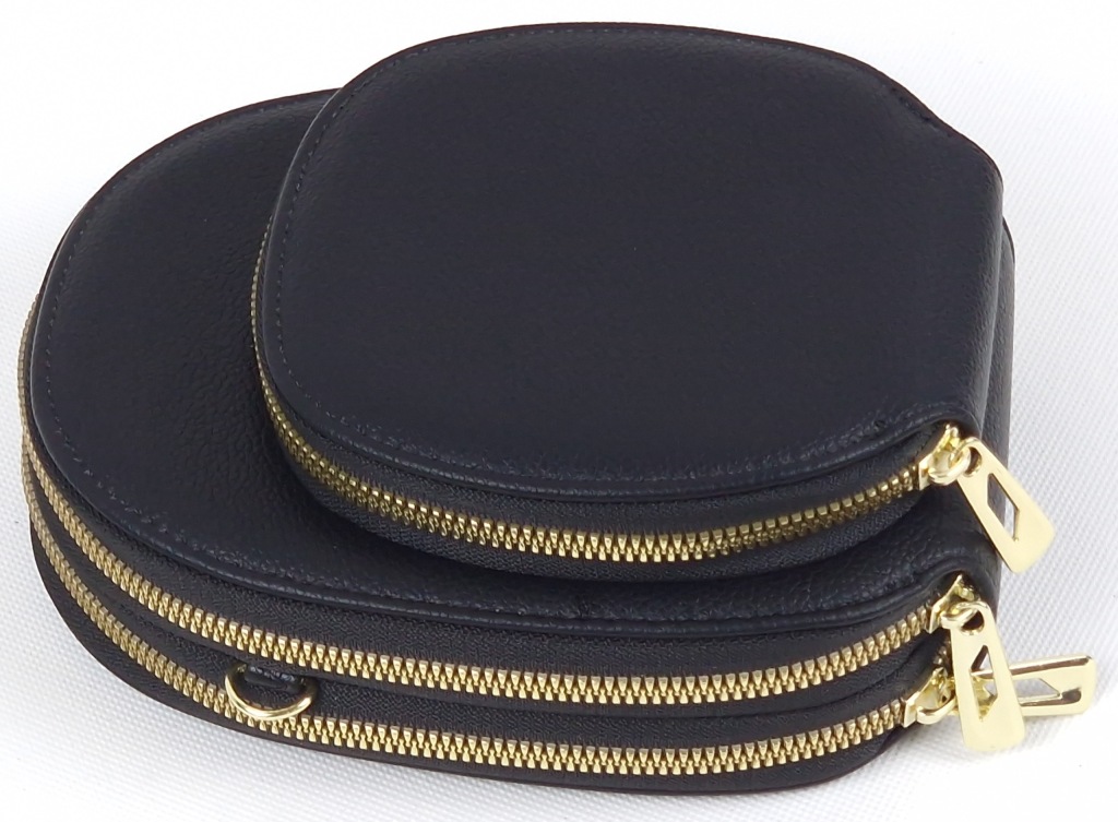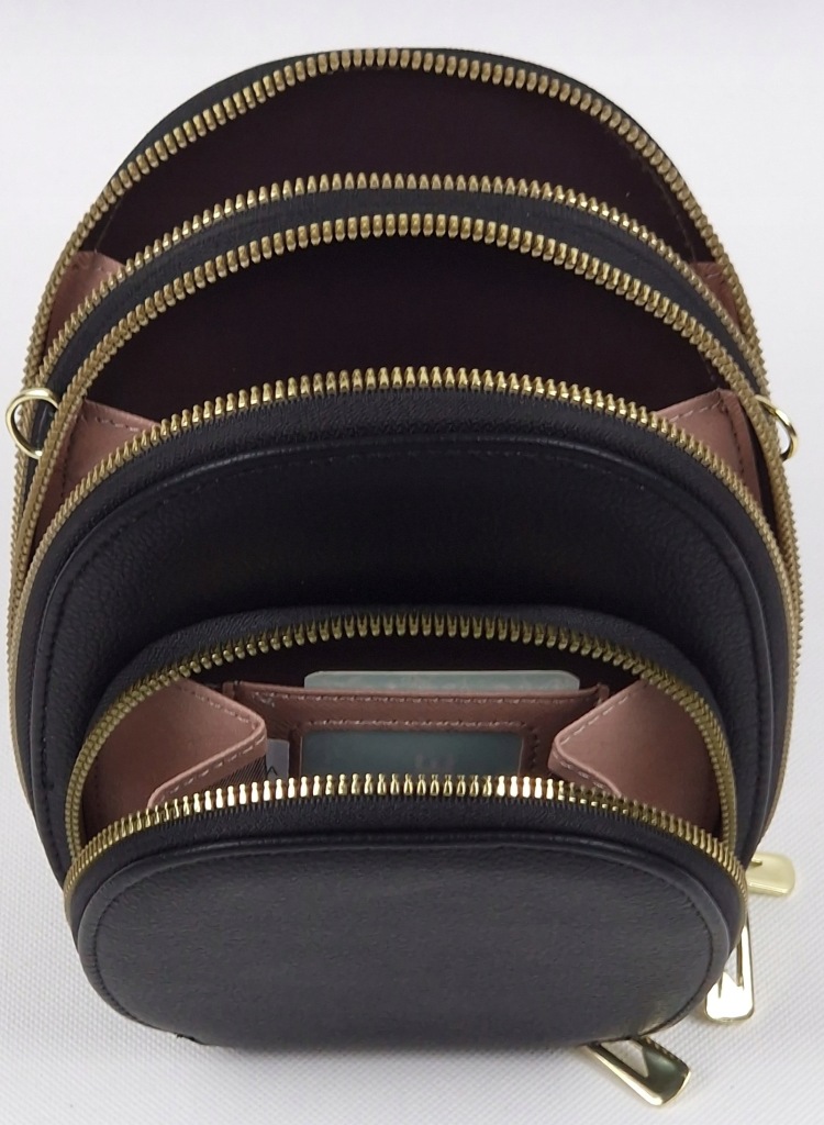 Posiada jedną małą i dwie duże komory zapinane na zamek. Duże dzielone na pół i z miejscem na karty - wizytówki, w małej dodatkowe miejsce na zdjęcie.