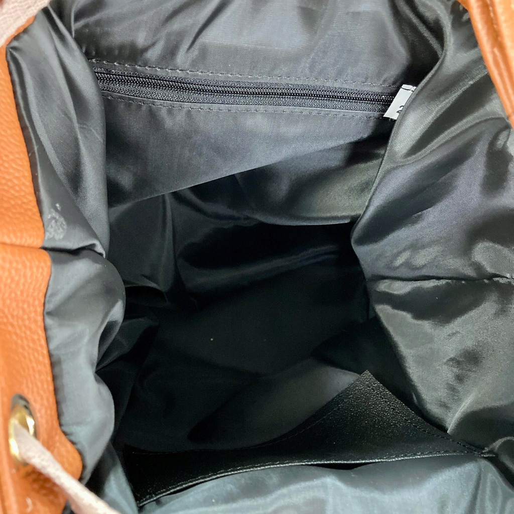 Kieszonki: W środku jedna komora, kieszonki na ściankach torebki oraz kieszonka z tyłu na suwak. Torebka nie ma suwaka w środku, ściągana jest troczkami.