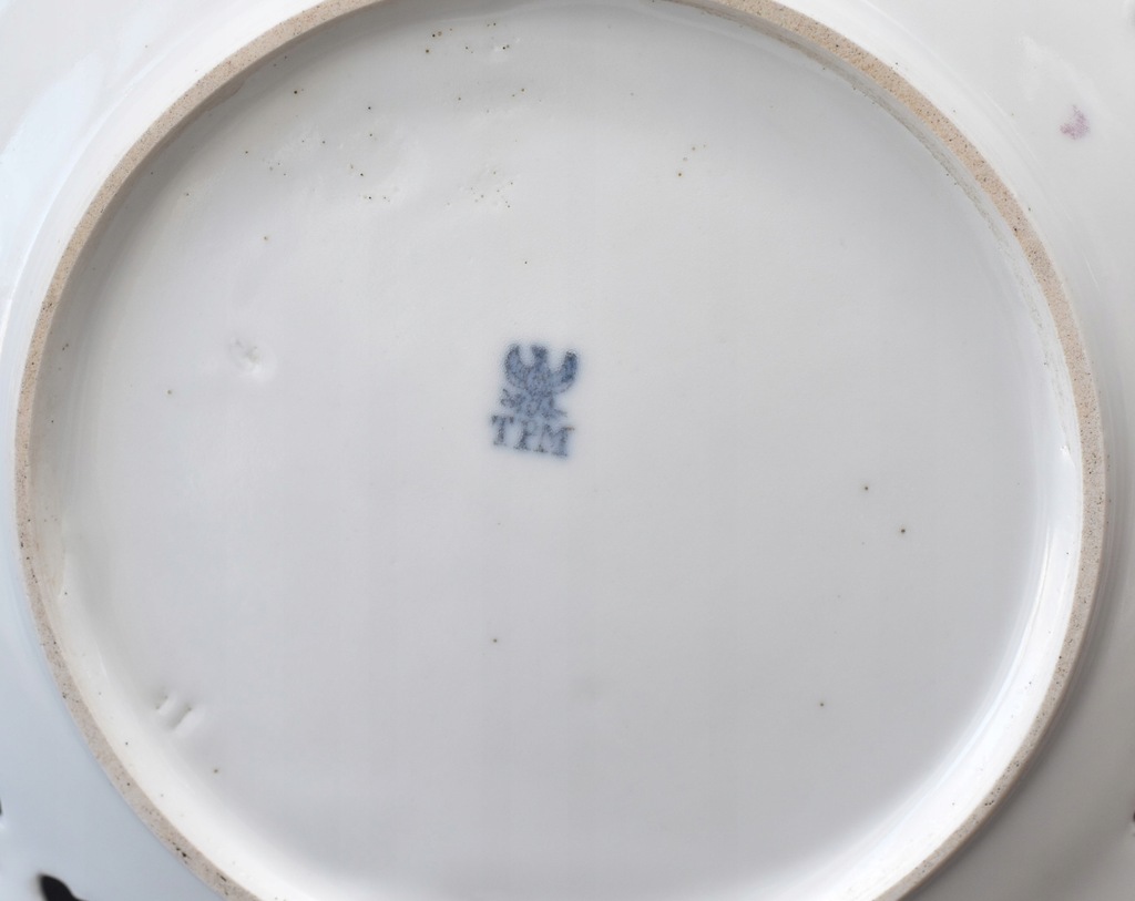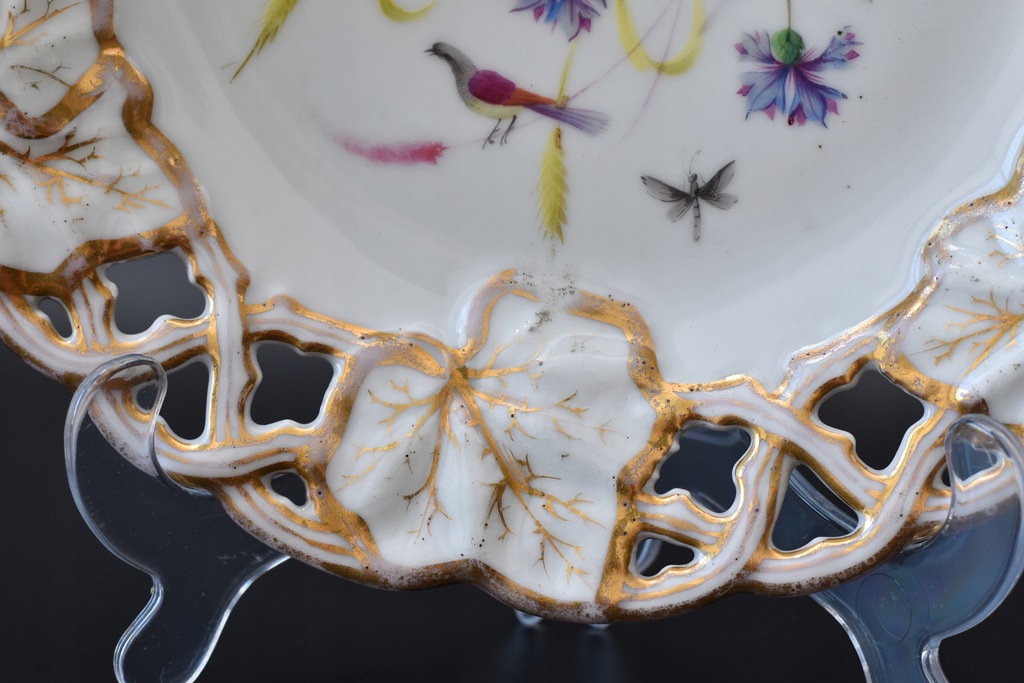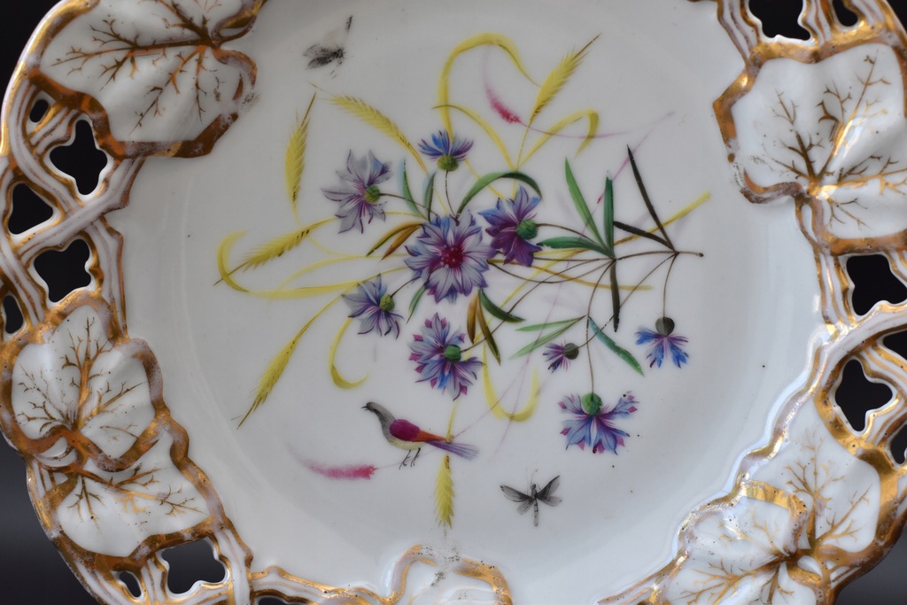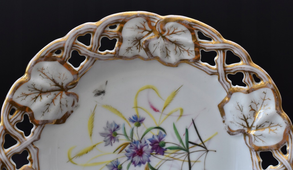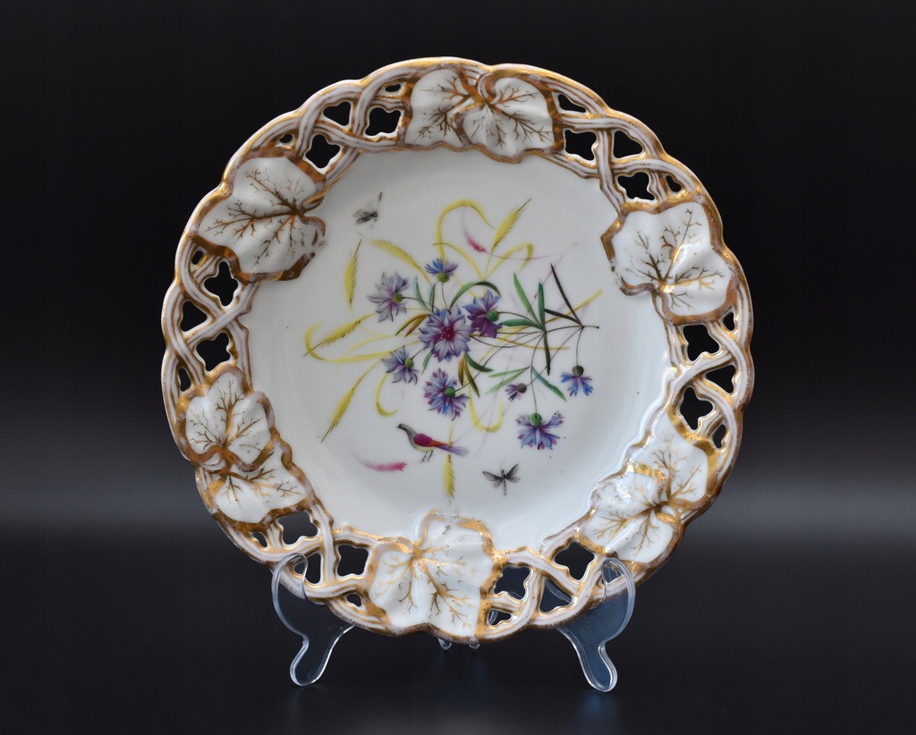 Ażurowa patera z manufaktury Carla Tielscha ze Starego Zdroju. Dekorowana polnym motywem na którym znalazły się chabry, kłosy, ważki i jeden mały ptaszek. Całość ręcznie malowana.