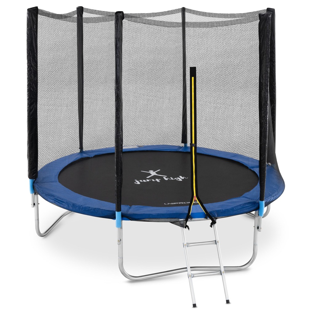 Trampolina o średnicy 240 cm i wytrzymująca obciążenia do 100 kg sprawi doskonałą zabawę w przydomowym ogrodzieczy na działce. Wytrzymałość urządzenia zapewnia mata z polipropylenu, która wytrzymuje duże obciążenia, jest elastyczna i antypoślizgowa. Matę podtrzymują solidne sprężyny pochłaniające drgania i zapewniające udźwig. Trampolina jest łatwa w montażu. Bezpieczeństwo zapewniają osłony na sprężyny oraz siatka ochronna z wygodnym zapięciem na zamek błyskawiczny. Drabinka mocowana do podłoża hakami ułatwia wchodzenie oraz schodzenie.