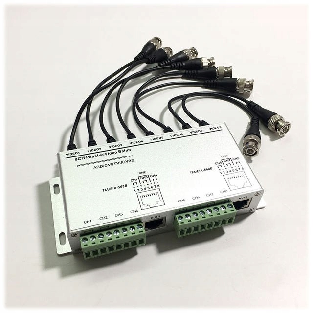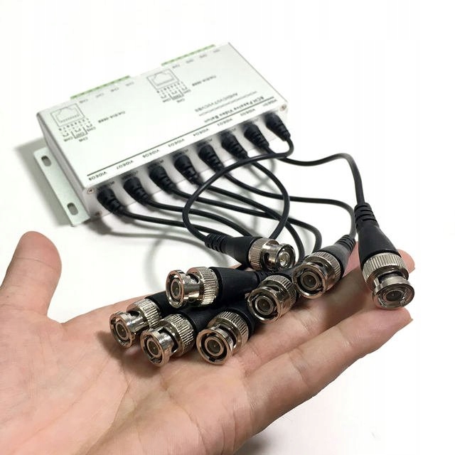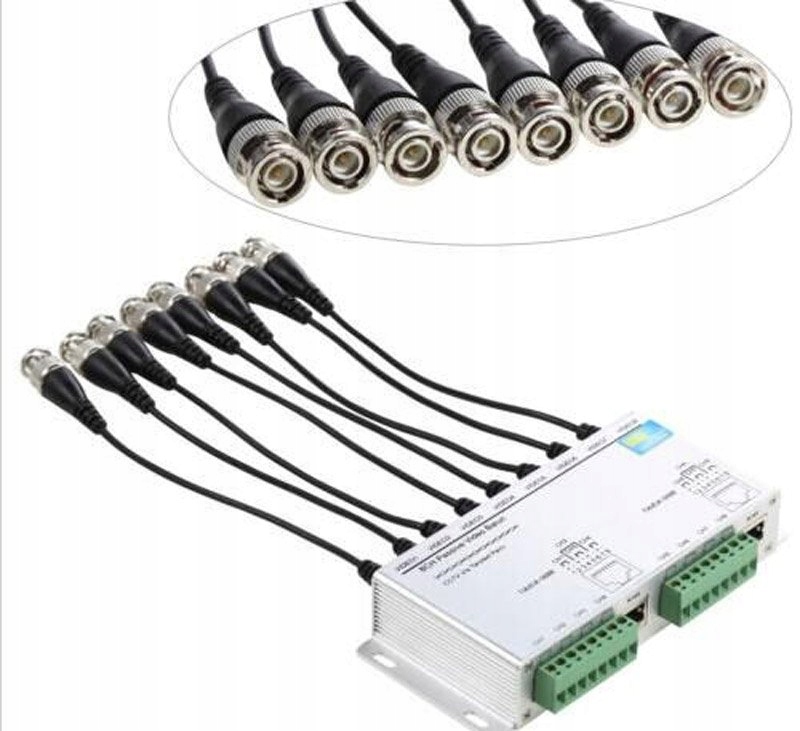 Ośmiokanałowy konwerter kablowy, umożliwiający przesyłanie analogowego obrazu video przy pomocy kabli LAN cat5. Możliwe jest przesłanie do 4 sygnałów wideo z 4 kamer CCTV przy pomocy 1 kabla LAN UTP CAT5 lub 3 sygnałów video i zasilania 12V.