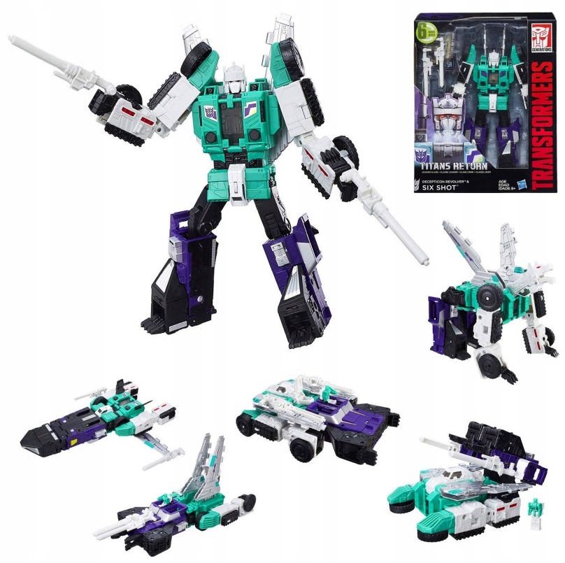 Ta figurka Six Shot w sześciu trybach zmienia się pomiędzy 6 trybami walki. Figurka klasy lidera zmienia się z robota w czołg w 22 krokach. Zawiera również 2 akcesoria i kolekcjonerską kartę postaci ze specyfikacjami technicznymi. Figurka Leader Class Six Shot Decepticon Revolver 9-calowa (23 cm). Figurka Six Shot ma 6 trybów - robota, ciężarówki, łodzi podwodnej, odrzutowca kosmicznego, wilka i czołgu. Figurka Mistrza Tytanów 1,25 cala (3 cm) staje się głową figurki Sześciu Strzałów