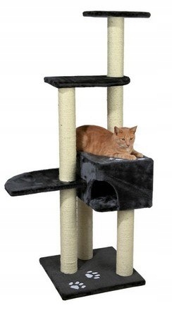 Wysoki drapak z półkami i domkiem. Staranne wykonanie sprawia, że staje się ozdobą pokoju. Słupki są pokryte sizalem, a wykończenie jest z przyjemnego pluszu, w kolorze antracytu.