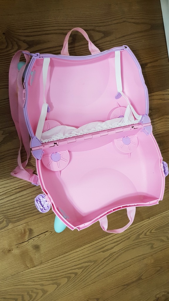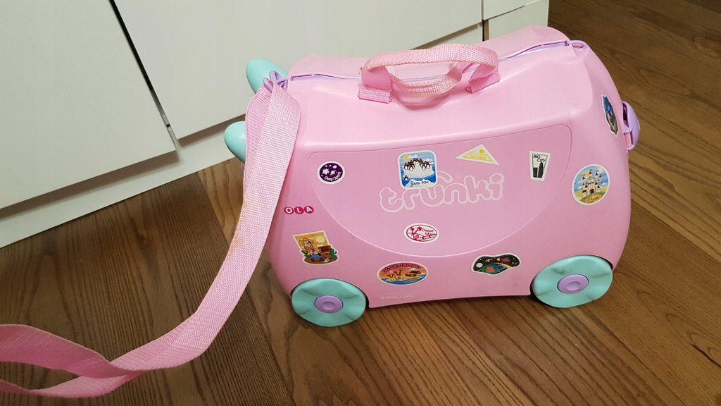 Walizeczki jest jak nowa ma na sobie ponaklejane dedykowane dla niej naklejki, dorzucam niewykorzystane. Jedyne zabrudzenia powstały na pasku do ciągnięcia walizki, widoczne na jednym ze zdjęć.