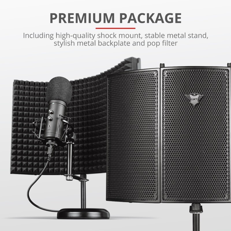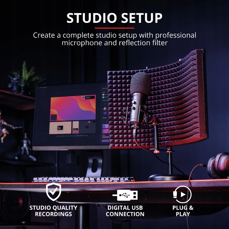 - Umieszczając osłonę odbiciową za mikrofonem, echa są redukowane, dzięki czemu jest to najlepsza konfiguracja studyjna dla każdego, kto potrzebuje wysokiej jakości nagrań głosowych. Panele osłony odblaskowej można dostosować do własnych upodobań, ponieważ całe urządzenie stoi stabilnie na ciężkiej metalowej podstawie ze zintegrowanym mocowaniem przeciwwstrząsowym. Z łatwością stworzysz w swoim pokoju pełne studio dźwiękowe.