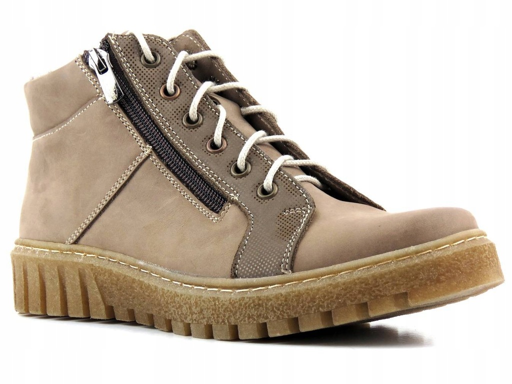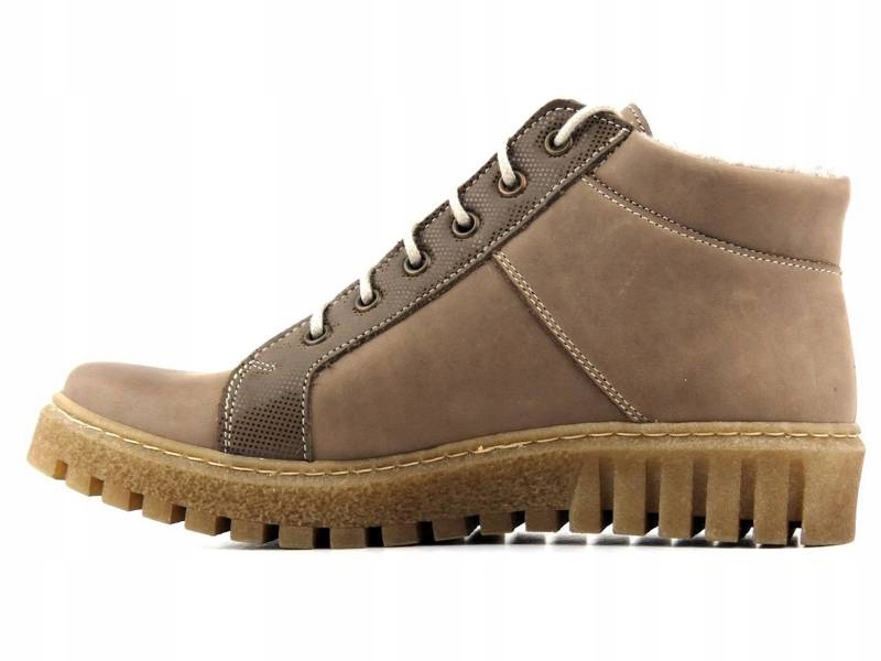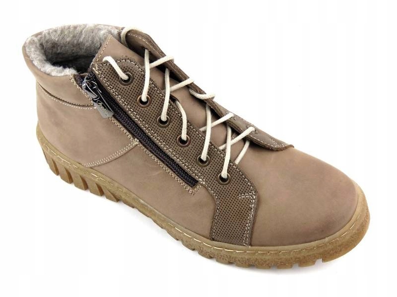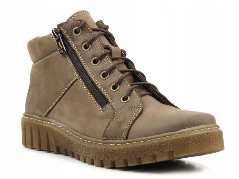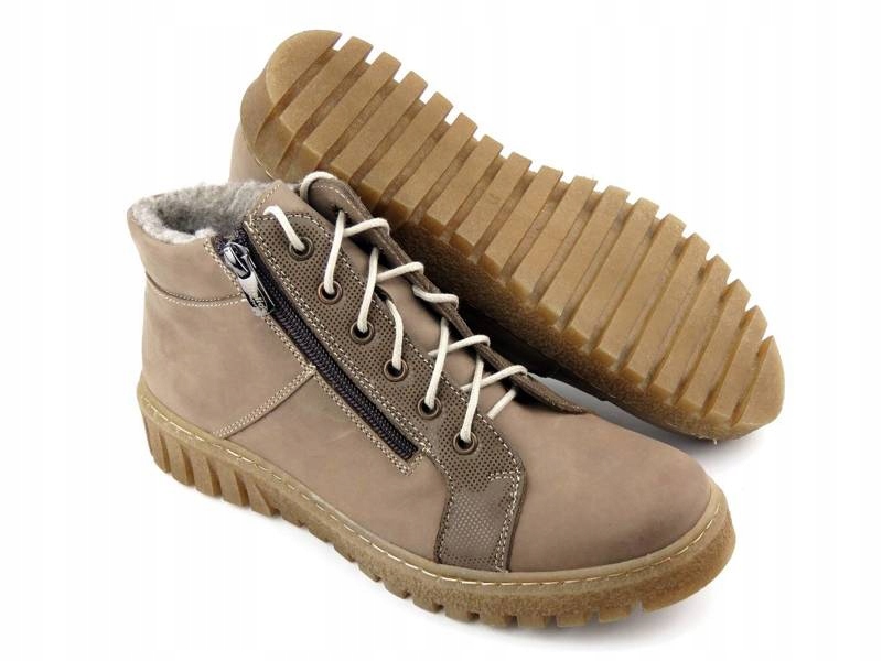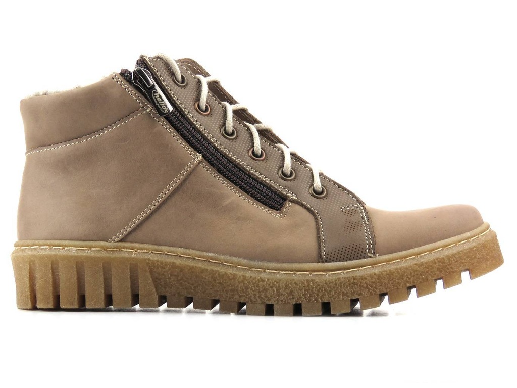 Trzewiki damskie cenionej polskiej marki Helios Komfort zostały wykonane z wysokiej jakości skóry naturalnej licowej w kolorze beżowym. Wnętrze jest ocieplone grubą wełną naturalną. Dzięki regulacji sznurowadeł, model można dobrze dopasować do stopy. Dodatkowe zapięcie na suwak pozwala na szybkie nakładanie. Podeszwa z termokauczuku zapewnia dobrą izolację od podłoża i jest antypoślizgowa. Część cholewki ozdobiono połyskującym ryżykiem.