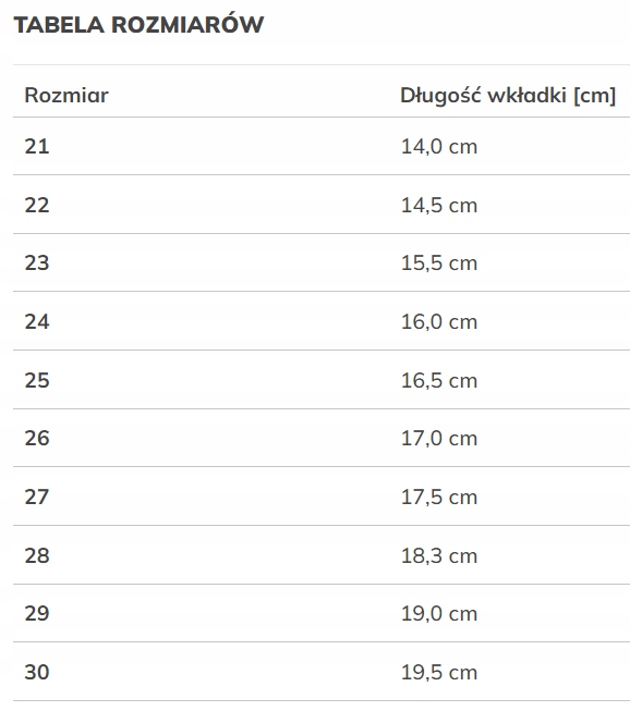 - Rozmiar 30 - Długość wkładki [cm]: 19,5 cm