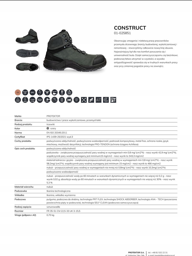 Obserwując zmagania i niełatwą pracę pracowników przemysłu drzewnego, branży budowlanej, wykończeniowej i remontowej – stworzyliśmy całkowicie nową linię obuwia. Najważniejszy był dla nas komfort poruszania się i uniwersalność buta. Dzięki samoczyszczącemu się bieżnikowi, podeszwę łatwo utrzymać w czystości, a wysoka antypoślizgowość sprawdza się w trudnych warunkach pracy oraz przy zmiennej pogodzie pracy na zewnątrz.