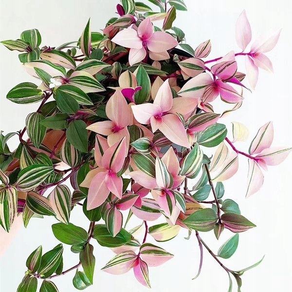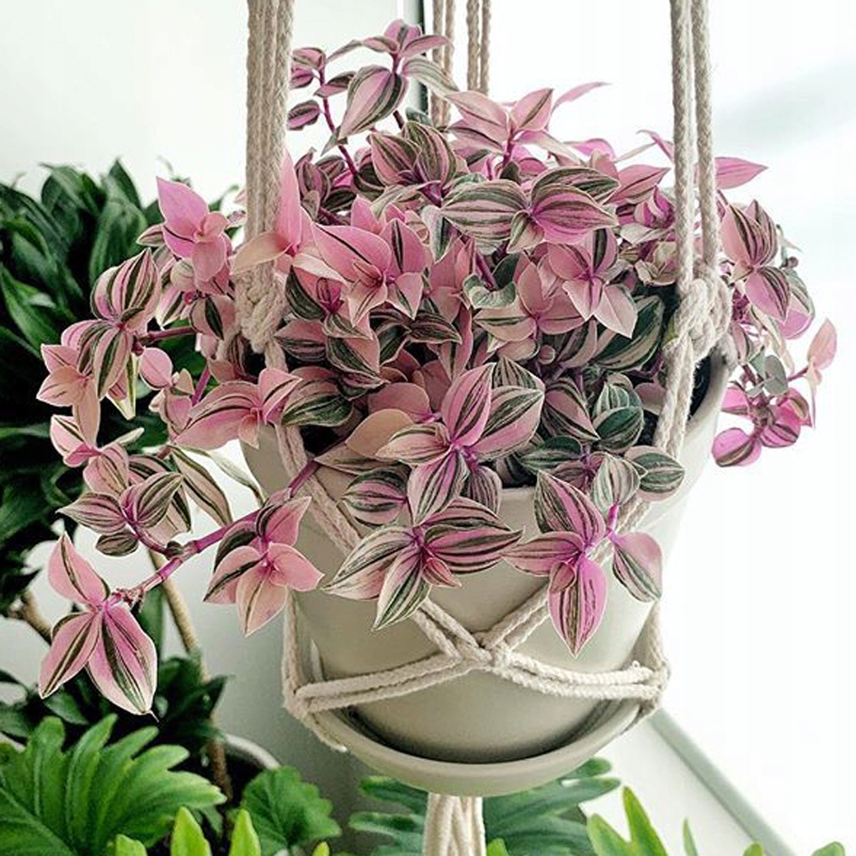 ☘️Jej drobne, lancetowate liście są połyskujące i gęsto oblepiają liczne pędy. Elementem, który szczególnie przykuwa wzrok jest niesamowicie barwne ulistnienie, które wyróżnia odmianę 'Tricolor' od innych popularnych trzykrotek. Na powierzchni blaszek liściowych możemy ujrzeć naprzemiennie układające się różne odcienie zieleni, różu oraz koloru kremowego. Ich spodnia część ma niesamowite fioletowo-purpurowe ubarwienie. Roślina charakteryzuje się zwartym i rozłożystym pokrojem. Docelowo jej wydłużone pędy przewieszają się poza brzeg donicy i tworzą imponujące, barwne kaskady. Dzięki swojej niebanalnej kolorystyce będzie uroczym, barwnym akcentem we wnętrzu Twojego domu, od którego trudno odciągnąć wzrok.