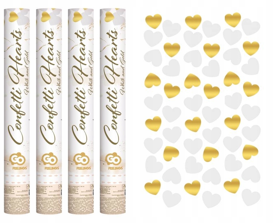 Tuby z konfetti - Złote i białe serduszka (foliowe i papierowe) 4szt