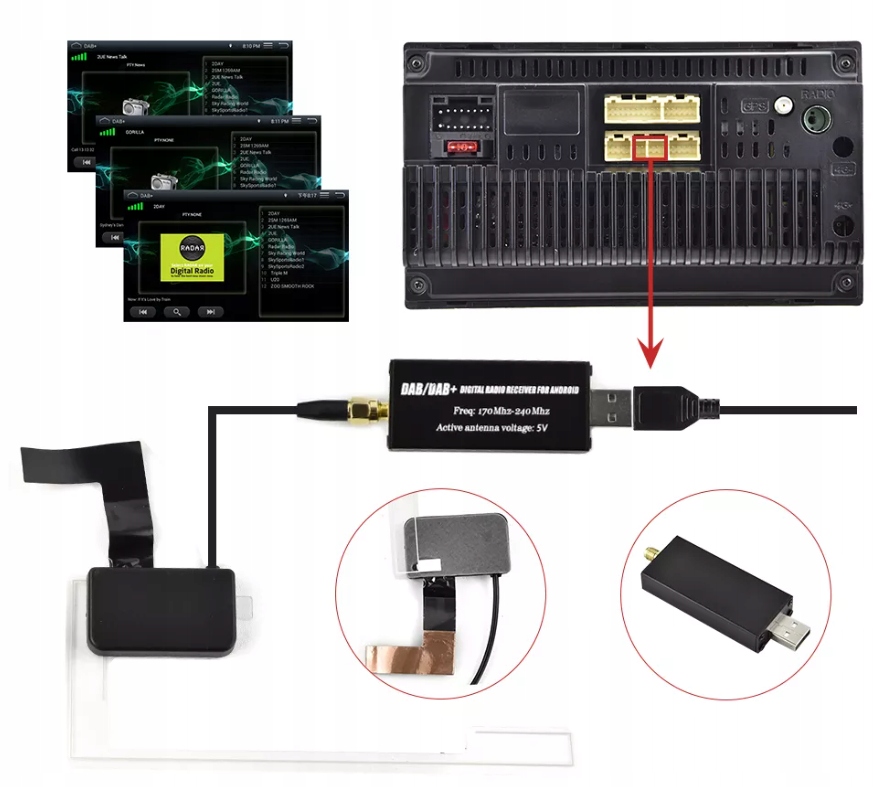 Nowy, wysokiej jakości nowoczesny tuner cyfrowy DAB/DAB+ do odbioru cyfrowego sygnału radiowego w radioodbiornikach samochodowych wyposażonych w system Android. Jest to innowacyjne rozwiązanie w dziedzinie odbioru sygnału radiowego, które w przyszłości zastąpi współczesny sygnał analogowy AM/FM. Tuner cechuje się wysoką jakością sygnału audio. Urządzenie działa na zasadzie plug and play. Tuner zasilany jest przez port USB, co oznacza, że nie jest wymagane podłączenie dodatkowego kabla zasilającego. Posiada kompaktowe rozmiary, dzięki czemu pasuje idealnie do wnętrza każdego samochodu.