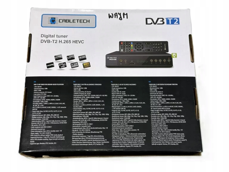 Tuner DVB-T2 HEVC Cabletech URZ0336B umożliwia odbiór naziemnej telewizji cyfrowej zarówno w standardzie DVB-T jaki i nowszym DVB-T2 z kodekiem HEVC. Dzięki kodekowi HEVC tuner będzie gwarantować prawidłowe działanie także po wprowadzeniu zmian standardu kodowania.